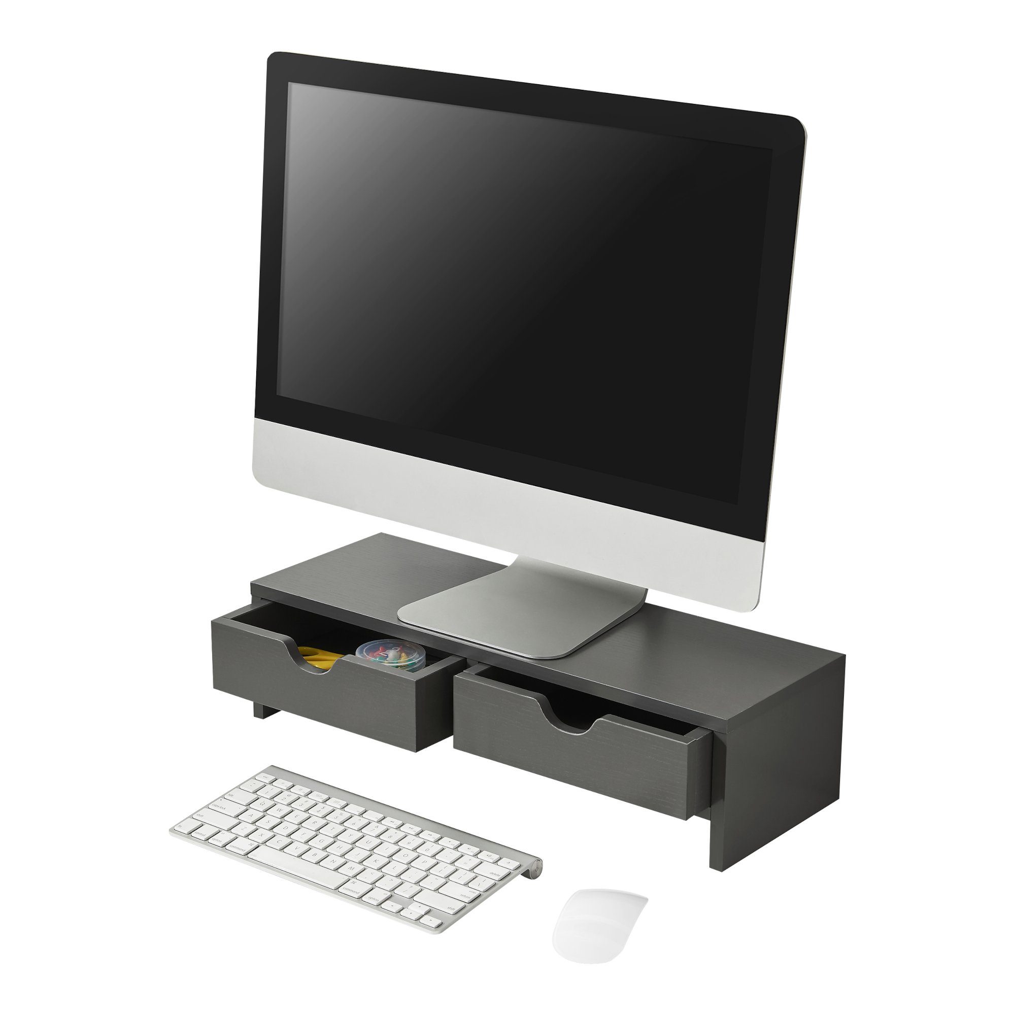 Der Monitorständer eignet sich ideal für Ihr Zuhause oder Ihr Büro, um Ihre Bildschirme auf eine ergonomische Höhe anzuheben. Desweiteren bietet der Bildschirmständer, durch seine Bauform, die Möglichkeit Gegenstände, wie bspw. die Tastatur darunter zu verstauen. Dadurch geht keine Ablagefläche auf Ihrem Schreibtisch verloren. Für weiteren Stauraum sorgen die 2 Schubladen.
