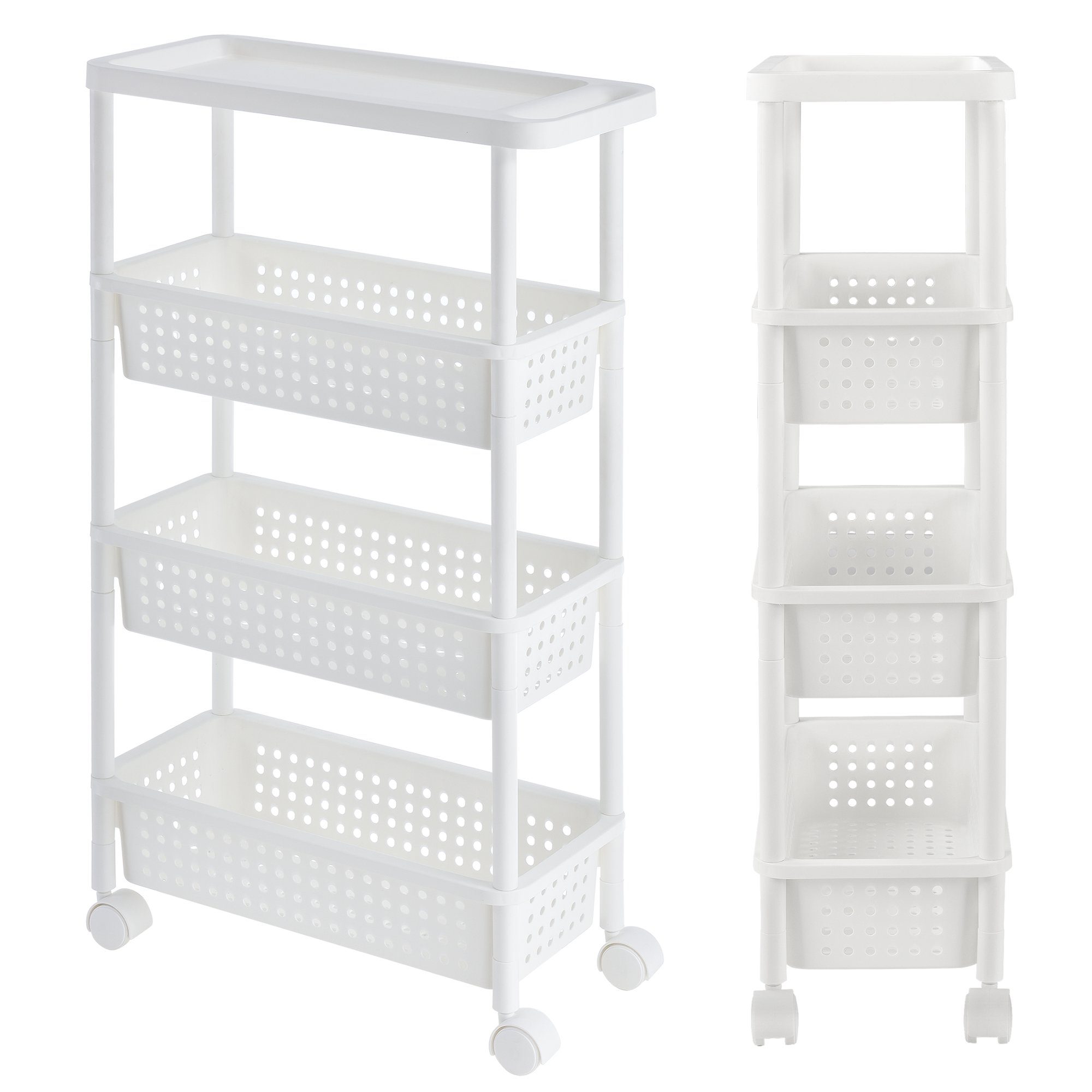 Das rollbare und praktische Nischenregal eignet sich perfekt um verschiedene Dinge auf kleinsten Raum zu verstauen. Das Allzweckregal kann in kleine Ecken verschoben werden und ermöglicht durch die Kunststoffkörbe und die obere Ablage eine sortierte Aufbewahrung.