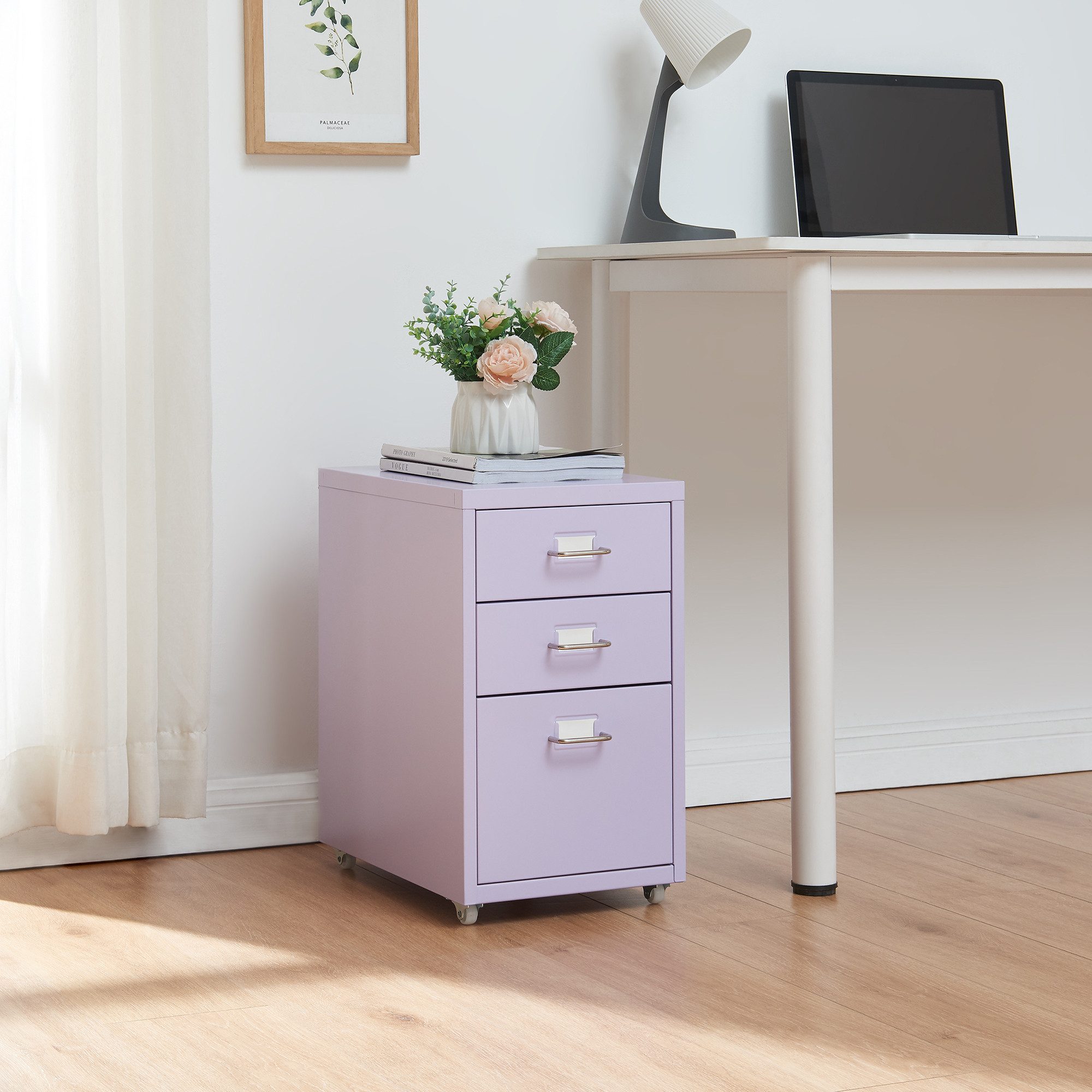 Der rollbare Schubladenschrank bietet eine erstklassige Lösung für die Organisation von Dokumenten und Büromaterialien. Mit insgesamt drei Schubladen – zwei kleinen und einer großen – zeichnet er sich durch vielseitige Aufbewahrungsmöglichkeiten aus.
