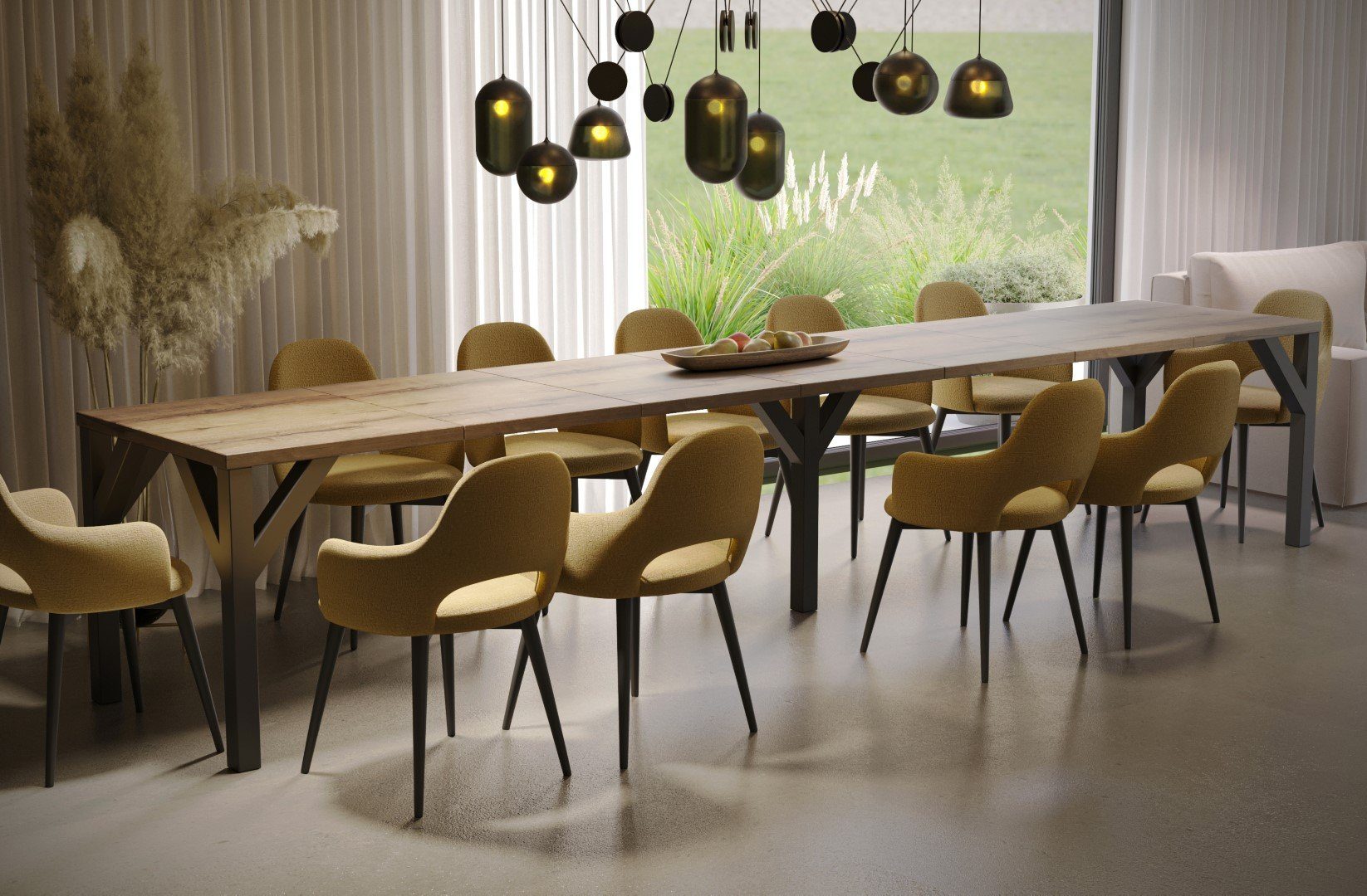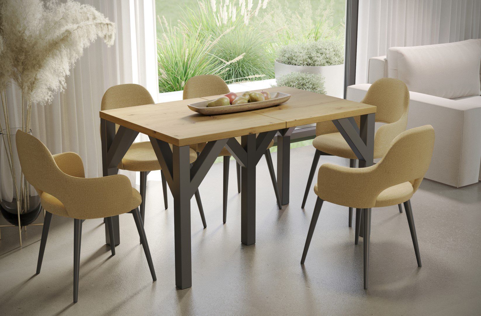 Der Esstisch bietet die Möglichkeit, Erweiterungsplatten einzeln einzusetzen und bietet damit flexible Einsatzmöglichkeiten.