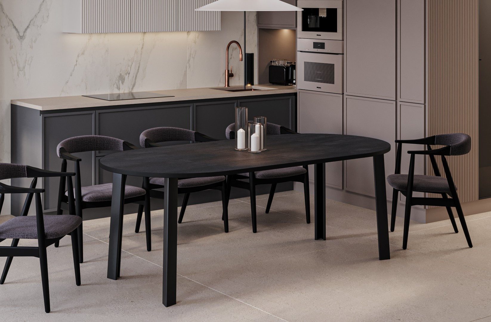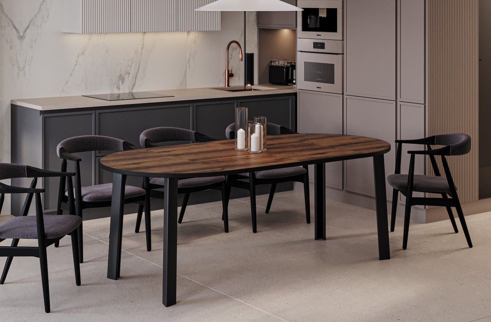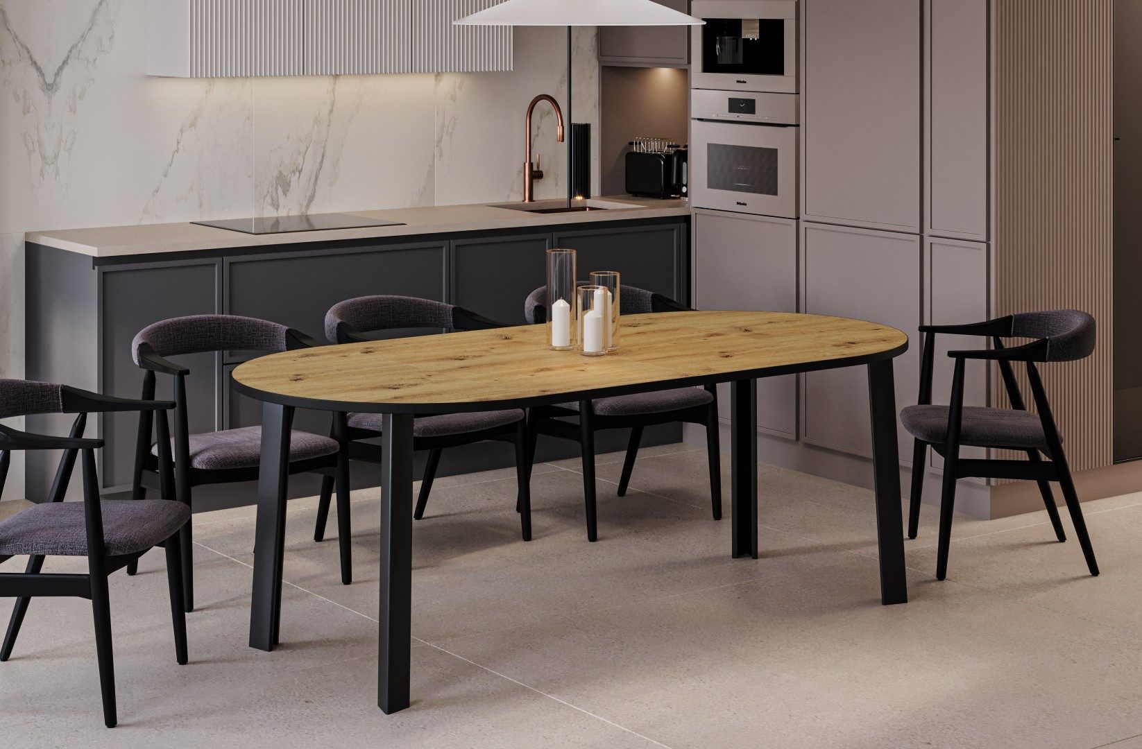 Die robuste Tischplatte aus langlebigem Nachbildungsfurnier mit fühlbarer Struktur überzeugt durch ihre Widerstandsfähigkeit. Das stabile Metallgestell in Schwarz Matt verleiht dem Tisch ein modernes und elegantes Erscheinungsbild.