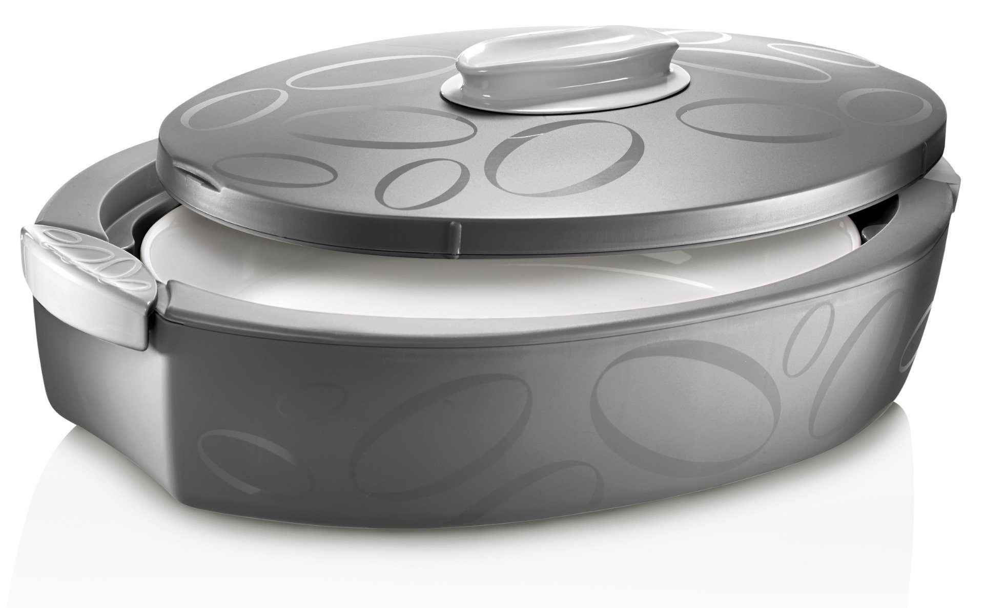 Es ist ein Warmhaltegeschirr mit einer Porzellanschale, die sich sowohl für die Anwendung in einem
