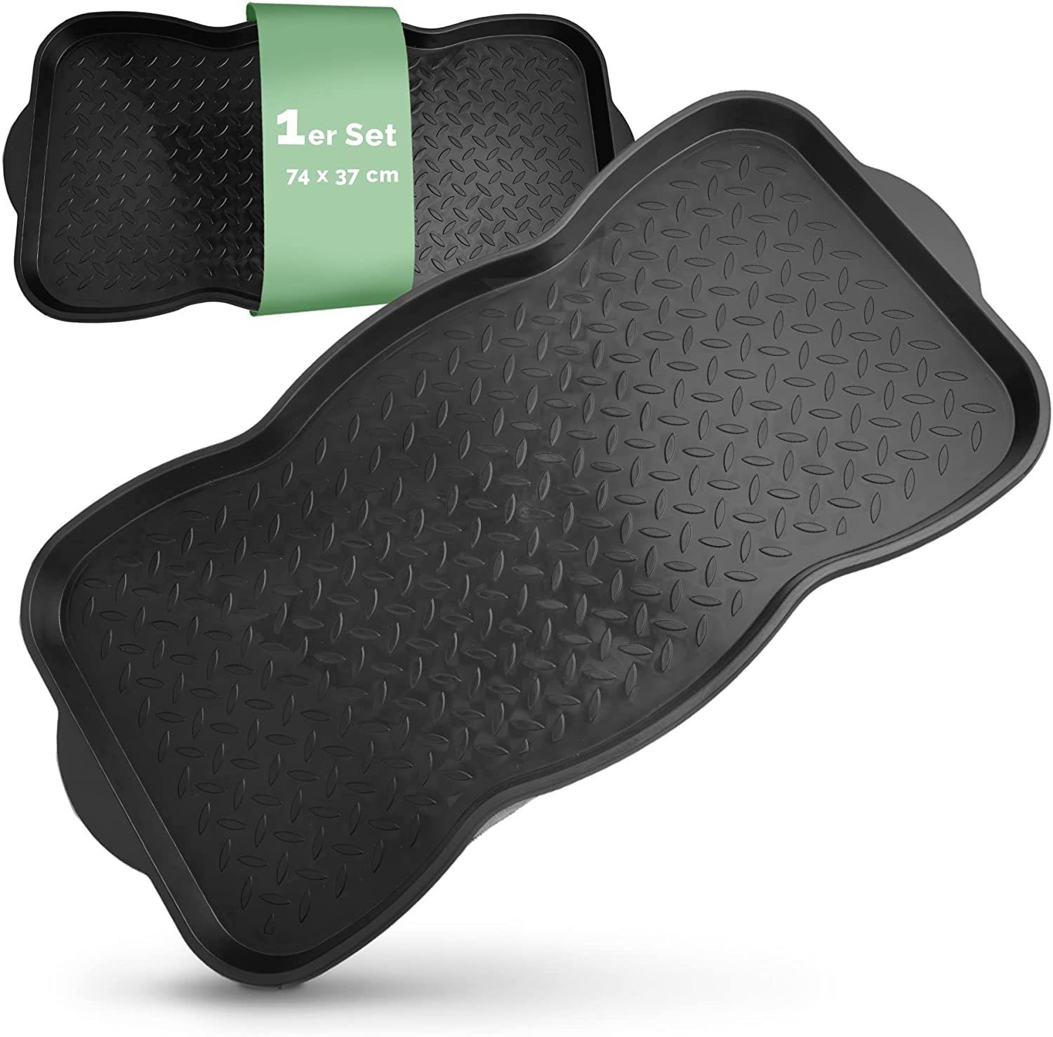 Endlich eine Schuhwanne, die mit modernem Design überall ein gutes Bild macht! Das elegante Schwarz und die gefälligen Formen sind nicht nur praktisch, sondern sehen auch noch gut aus. Sparen Sie sich Zeit und mühsames Putzen. So ein Schuhtablett hat überall Platz! Sie sind gern unterwegs mit dem Zelt oder dem Caravan? Dann ist die Schuhabtropfschale ein praktischer Begleiter. Sie schützen das Zelt oder den Campingbus vor Staub, Matsch und Nässe. Gerade bei etwas beengten Verhältnissen hilft Ihnen die Schuhablage, Sauberkeit und Ordnung zu halten. Sie können die Schuhe oder Ihre Wanderstiefel auch draußen auf der Schuhwanne trocknen. Die Luft kann durch die intelligente Oberfläche besser zirkulieren, als wenn Sie die Schuhe auf den Boden stellen. Bei unseren Produkten achten wir auch darauf, dass sie Ihnen einen möglichst großen Nutzen bringen. Darum hat unsere Schuhabtropfschale in der Mitte eine runde Aussparung. Dieser Platz eignet sich perfekt für einen Futternapf! Oder für zwei oder drei Futternäpfe. Die Matte ist leicht zu reinigen und ist für eine lange Nutzung ausgelegt. Sie haben zwei Hauseingänge und brauchen zwei Schuhablagen? Oder Sie brauchen eine Schuhablage für Haus, Garage und Garten? Oder eine Schuhwanne fürs Camping und eine Napfunterlage für Ihren Hund oder Ihre Katze? Auch daran haben wir gedacht! Bestellen Sie am besten gleich das 2er- oder das 3er-Set. Wenn Sie die Matten mit erhöhtem Rand erst einmal zuhause haben, fallen Ihnen sicher sogar noch mehr Verwendungsmöglichkeiten ein. Zum Beispiel beim Malern oder Tapezieren als Unterlage für den Farbeimer oder den Eimer mit Kleister. Empfindliche Böden schützt die Schale auch als Untersatz für die Gießkanne.
