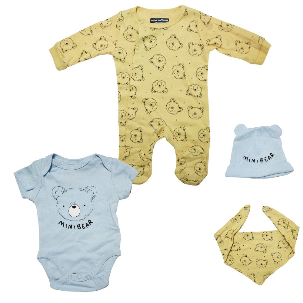 Das Set beinhaltet einen Kurzarm-Body, einen langärmeligen Strampler, ein Lätzchen und eine niedliche Mütze – alles mit passendem Teddybär-Motiv.