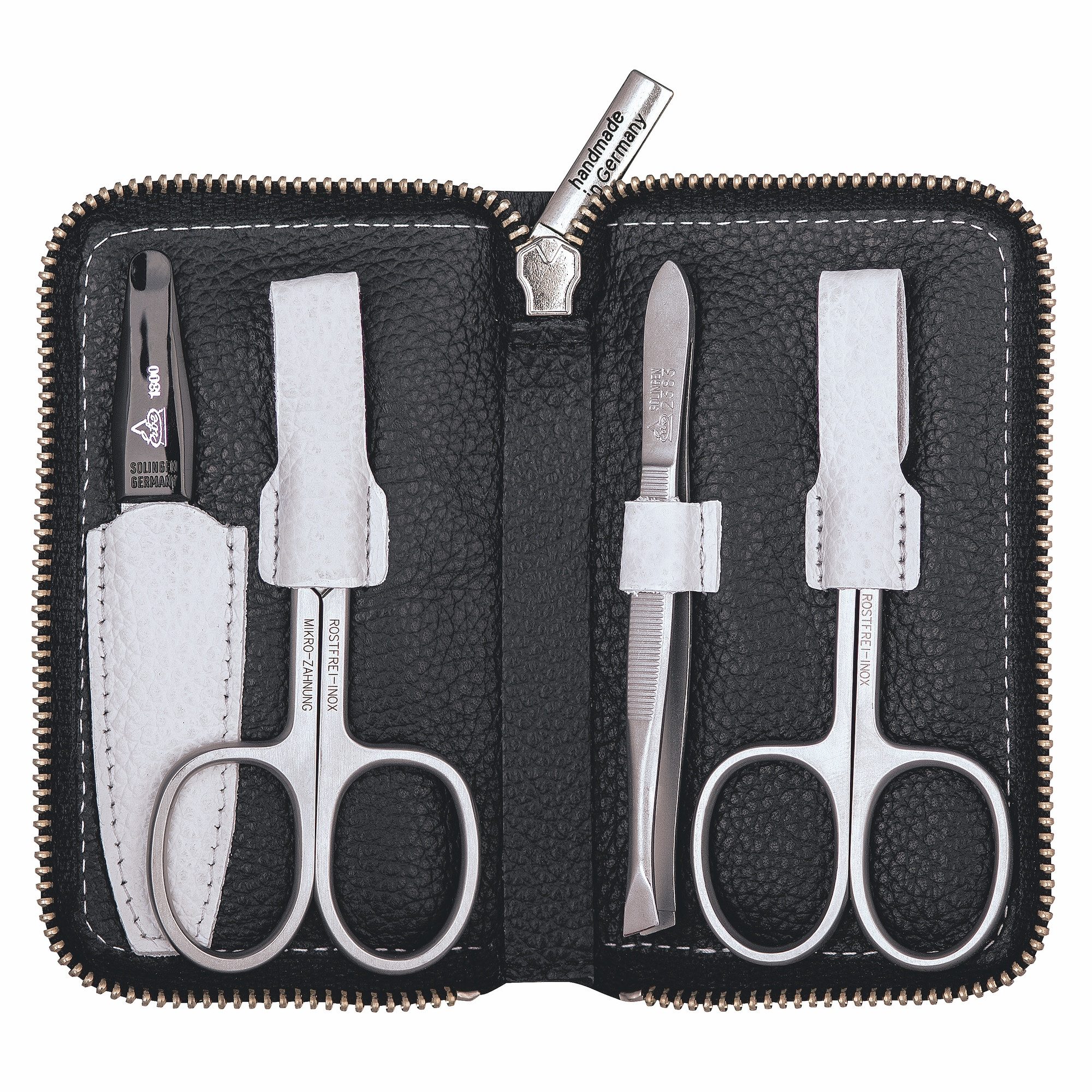 Lieferumfang | 4-teiliges Nagelpflegeset im hochwertigem Lederetui, ERBE-Manicure Reißverschluss Etui - Serie "Colorado" 4-tlg, Inhalt: Nagelschere Inox Mikrozahnung, Hautschere Inox, Pinzette schräg Inox, Mini Saphirfeile |