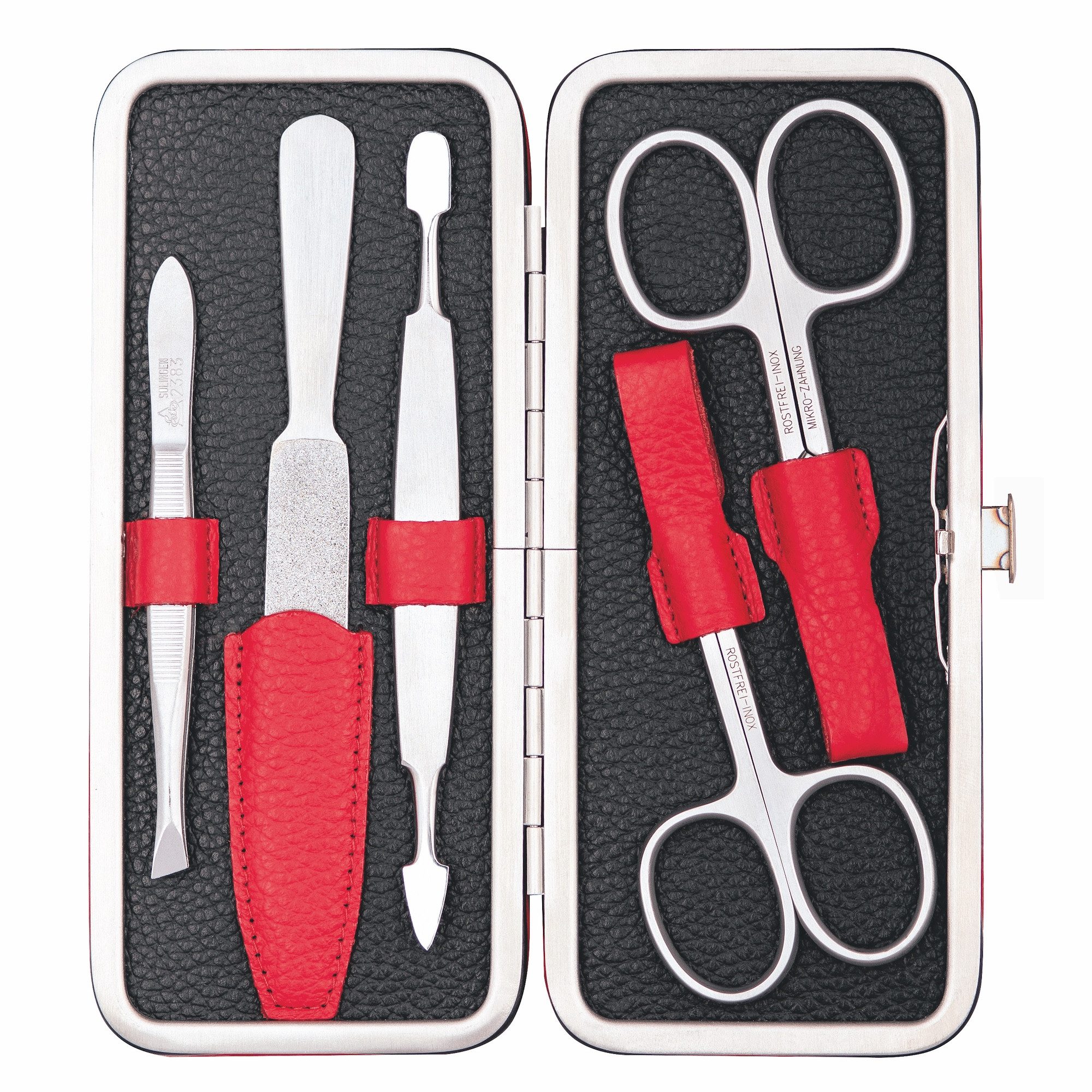 Lieferumfang | 5-teiliges Nagelpflegeset im hochwertigem Lederetui, ERBE-Manicure Bügel Etui - Serie "Colorado" 5-tlg, Inhalt: Nagelschere Inox Mikrozahnung, Hautschere Inox, Pinzette schräg Inox, Saphirfeile Inox, Doppelinstrument Inox |