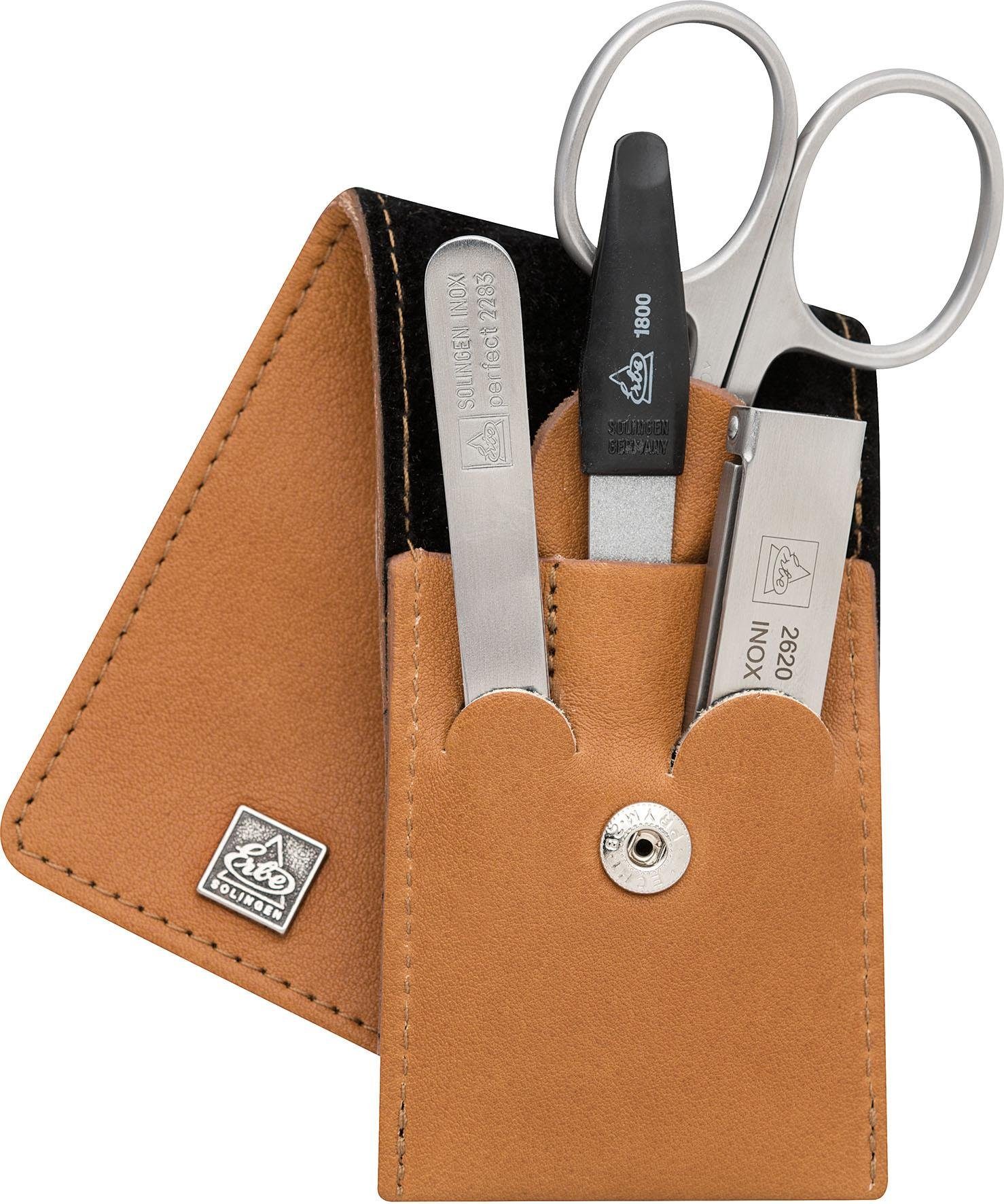 Pflegehinweise | Das Etui und die Instrumente an einem trockenen Ort aufbewahren. Pinzette, Knipser und Schere möglichst nach jedem Gebrauch mit einem trockenen, festen Tuch abwischen. Die Schere und Knipser von Zeit zu Zeit mit einem Tropfen Öl am Gelenk nachölen. Die Saphirfeile nach der Verwendung ausklopfen oder unter fließendem Wasser abspülen. |