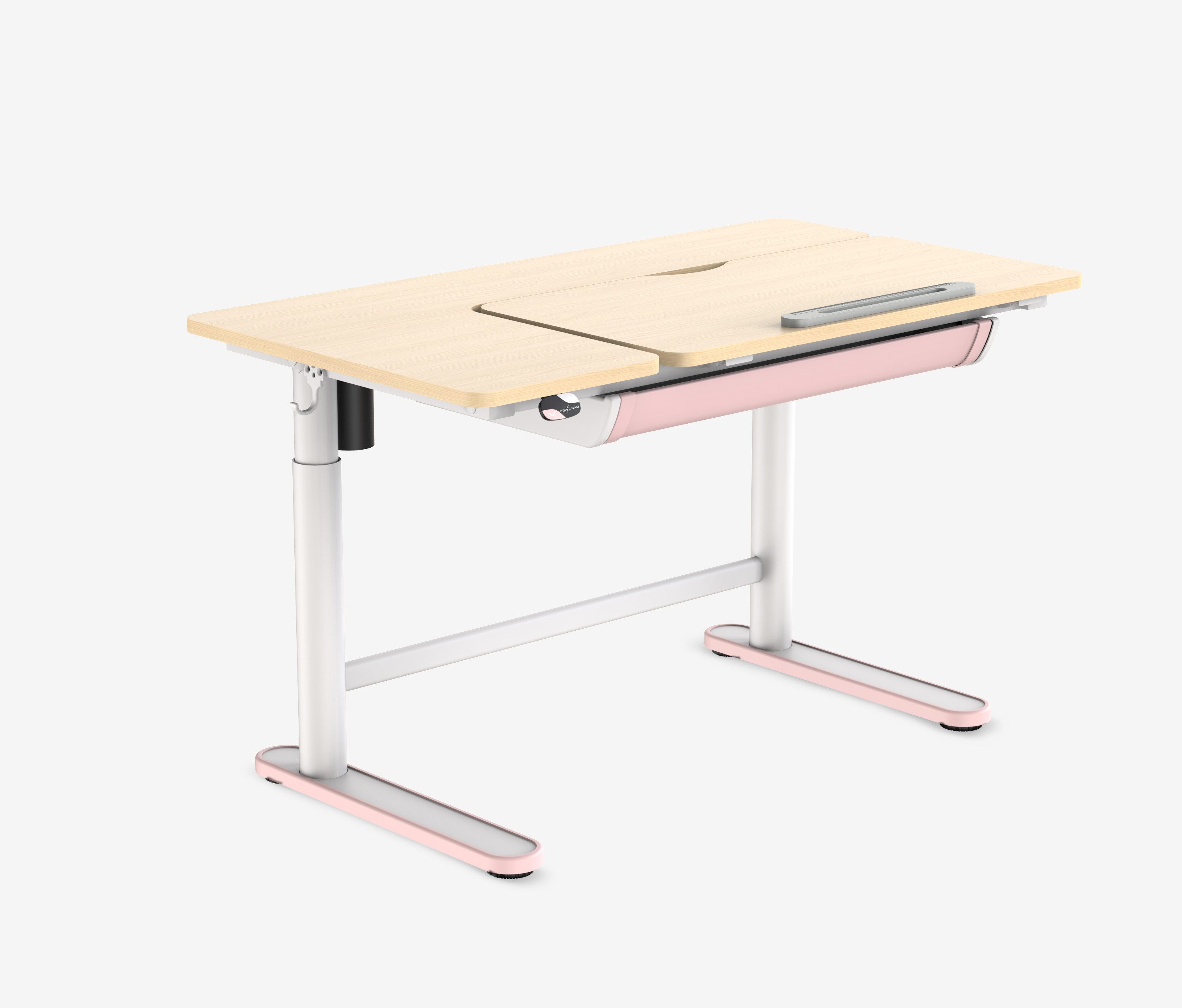 Unser Schreibtisch fürs Kinderzimmer: Ob Basteln, Hausaufgaben machen oder Zeit am Computer, die Dauer, die Kinder am Schreibtisch verbringen, nimmt mit dem Alter - spätestens jedoch mit der Einschulung - zu. Da besonders im Wachstum eine gesunde Körperhaltung enorm wichtig ist, sollten Sie auch schon früh auf die richtige Haltung Ihres Kindes am Schreibtisch achten. Dies gelingt nur, wenn der Kinderschreibtisch höhenverstellbar ist und mit dem Kind mitwachsen kann. Dieser höhenverstellbare Kinderschreibtisch ermöglicht zudem das Lernen und Spielen im Sitzen wie auch im Stehen. So kann von Beginn an ein gesunder Umgang mit Tätigkeiten am Schreibtisch trainiert werden. Unser ergonomischer Kinderschreibtisch ist mittels Softtouch-Button zwischen 55 und 89 cm elektrisch höhenverstellbar. Er ist der optimale Schreibtisch zum Mitwachsen für Kinder mit einer Körpergröße von 120 bis 160 cm und macht den Wechsel der Sitz- und Stehpositionen ganz einfach. Die matt beschichtete Schreibtischplatte im Ahorn-Dekor verhindert störende Lichtreflexionen und schont die Augen. Gleichzeitig ist die 112 x 60 cm große Tischfläche durch die robuste Melaminbeschichtung unempfindlich und lässt sich einfach reinigen. Besonders praktisch ist dabei, dass eine Fläche mit der Размер 80 x 40 cm zwischen 0 und 40 Grad ohne viel Kraftaufwand geneigt werden kann. Buch, Tablet oder Zeichenpapier werden dabei von einer magnetischen Leiste vor dem Abrutschen geschützt. So kann Ihr Kind eine ideale Haltung zum Lesen, Schreiben oder auch Malen einnehmen, während auf der restlichen Tischfläche Gegenstände waagerecht und sicher stehen bleiben. Sollte die magnetische Leiste einmal im Weg sein, lässt sie sich schnell und einfach abnehmen. Speziell für Kinder entwickelt, schützen sowohl das offene Design der neigbaren Fläche wie auch der Kollisionssensor der Höhenverstellung Hände und andere Körperteile vor dem Einklemmen. Die abgerundeten Kanten der Schreibtischplatte sorgen für noch mehr Sicherheit und Schutz vor Verletzungen. Die extra große Schublade bietet genug Stauraum für Schreibutensilien und der integrierte Aufhänger ist ideal, um den Rucksack bzw. Tornister daran aufzuhängen und Schulsachen sofort griffbereit zu haben.