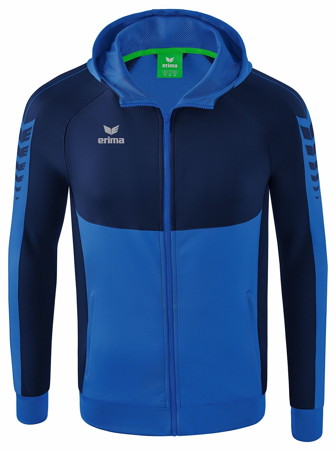 SIX WINGS TRAININGSJACKE MIT KAPUZE Funktionell und gemütlich! Die Kapuzenjacke macht deinen Look in jeder sportlichen Situation komplett. • Weicher Materialmix • Cotton Touch für ein angenehmes Tragegefühl • Hoher Kragen mit Kapuze • Breite Rippbündchen an Ärmel und Saum • Seitliche Reißverschlusstaschen • ERIMA Schwingen-Design auf der Schulter Material: 65% Polyester, 35% Baumwolle