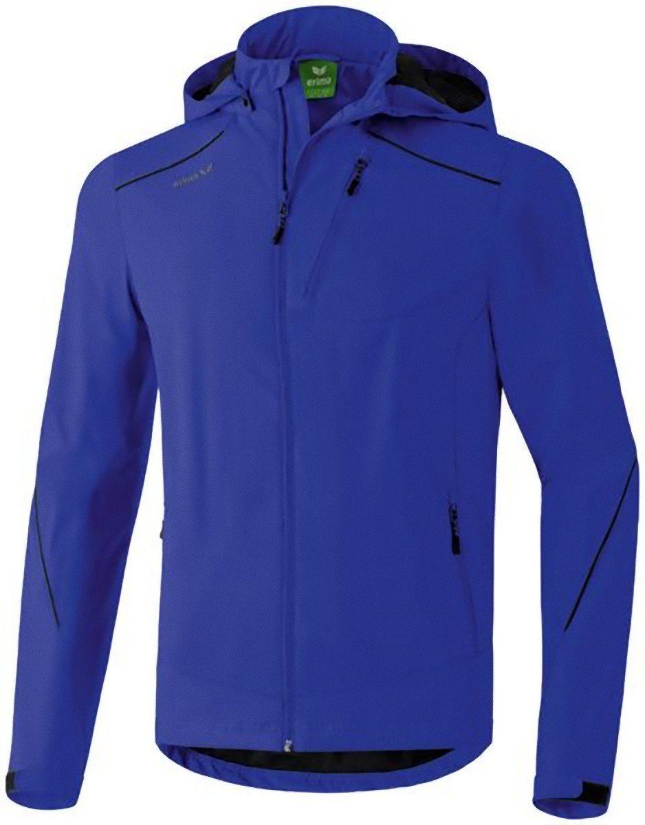 Funktionsjacke für Sport und Freizeit. ERIMA-TEX Membran: 5.000 mm Wassersäule, 3.000 g/m²/24h abnehmbare Kapuze elastisches Material für angenehmen Tragekomfort seitliche Eingrifftaschen mit Reißverschluss unterlegter Reißverschluss mit Kinnschutz für angenehmes Tragegefühl Brusttasche mit Reißverschluss verstellbarer Ärmelsaum mit Klettverschluss offener Saumabschluss Innenfutter aus Mesh