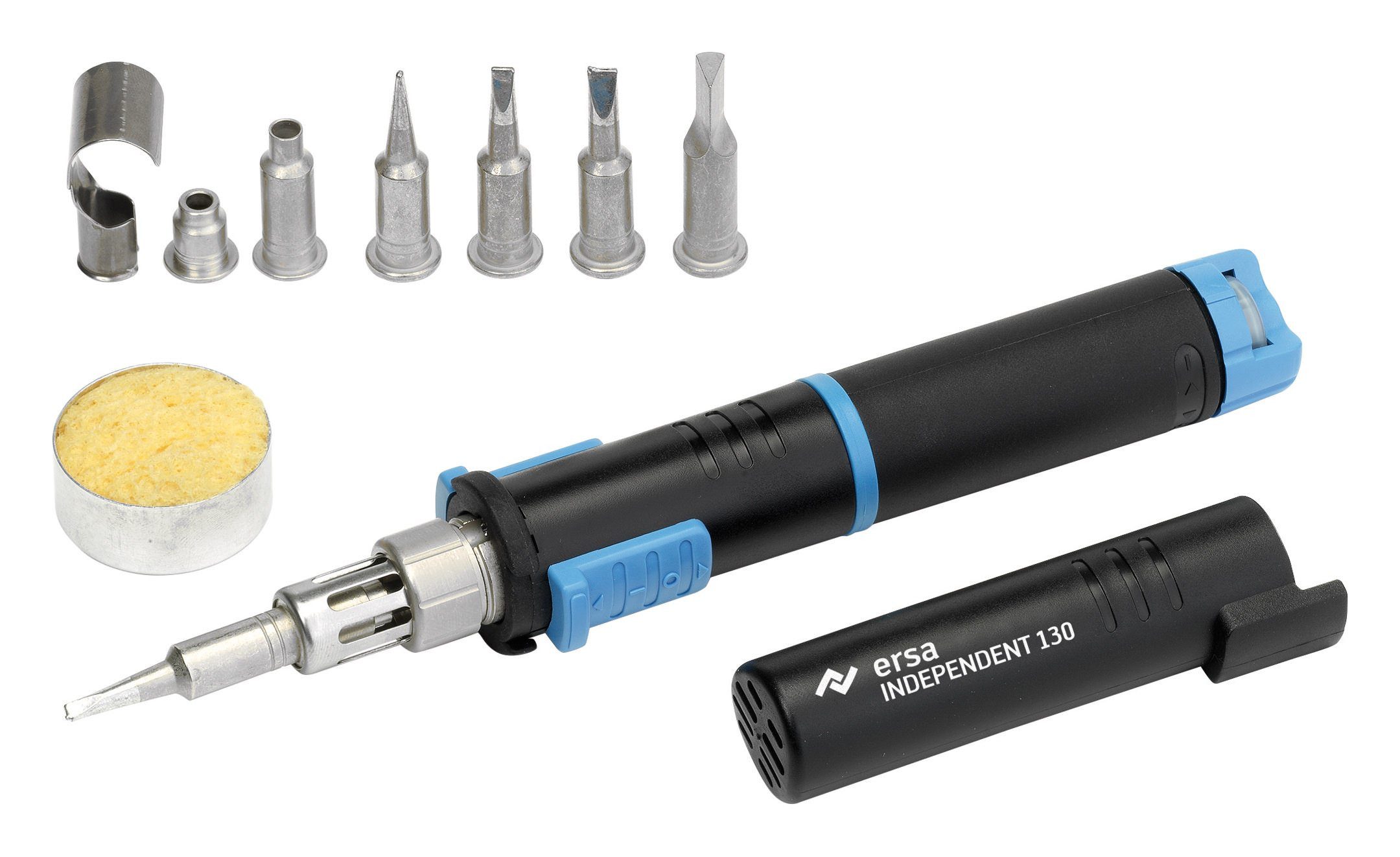 Gaslötkolben Independent 130 mit Spitze 2,4 mm, meißelförmig, Lötspitze 1,0 mm meißelförmig, Reinigungsschwamm, Schwammbehälter.