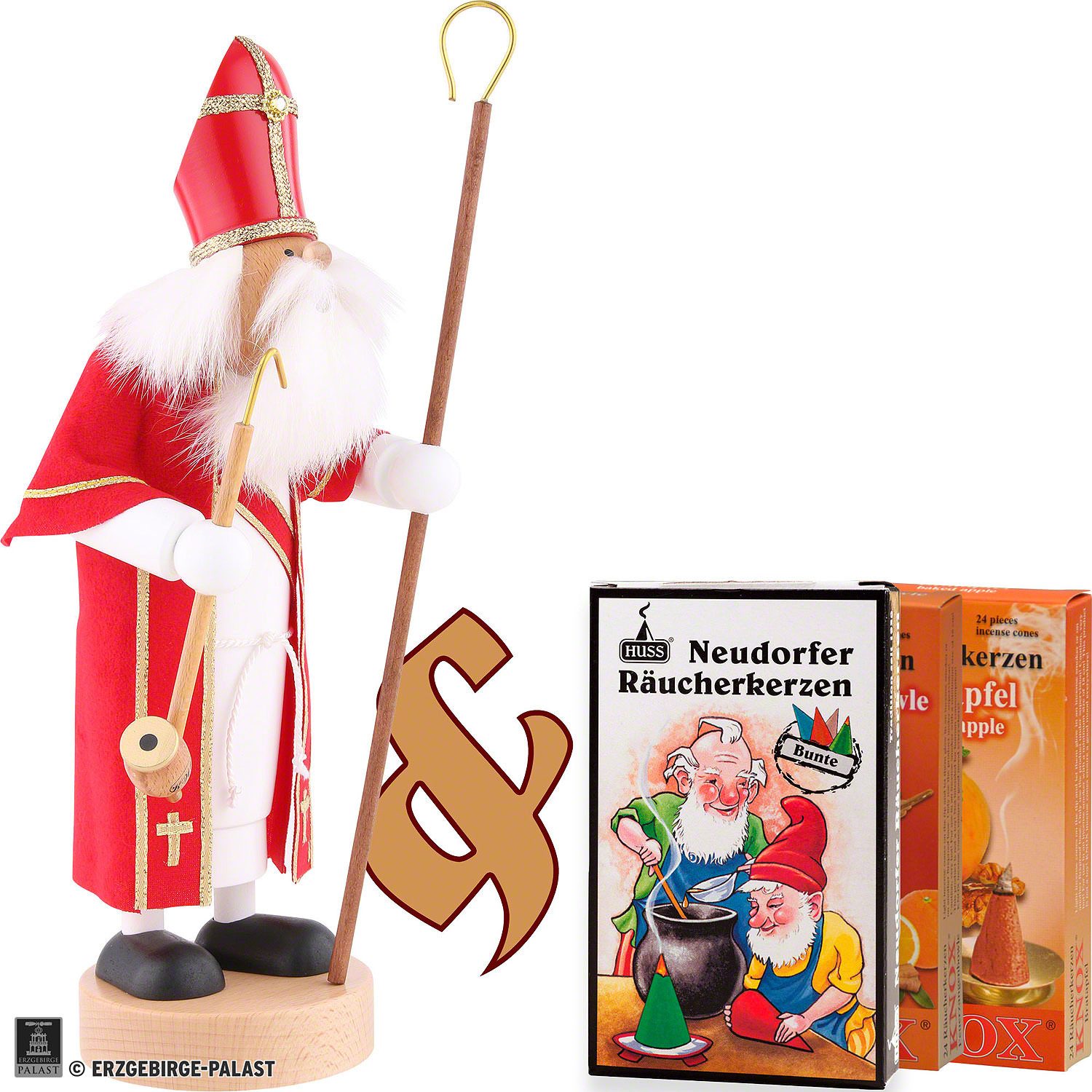 Erzgebirge-Palast Räuchermännchen Set Heiliger St. Nikolaus und drei Packungen Räucherkerzen Räucherman