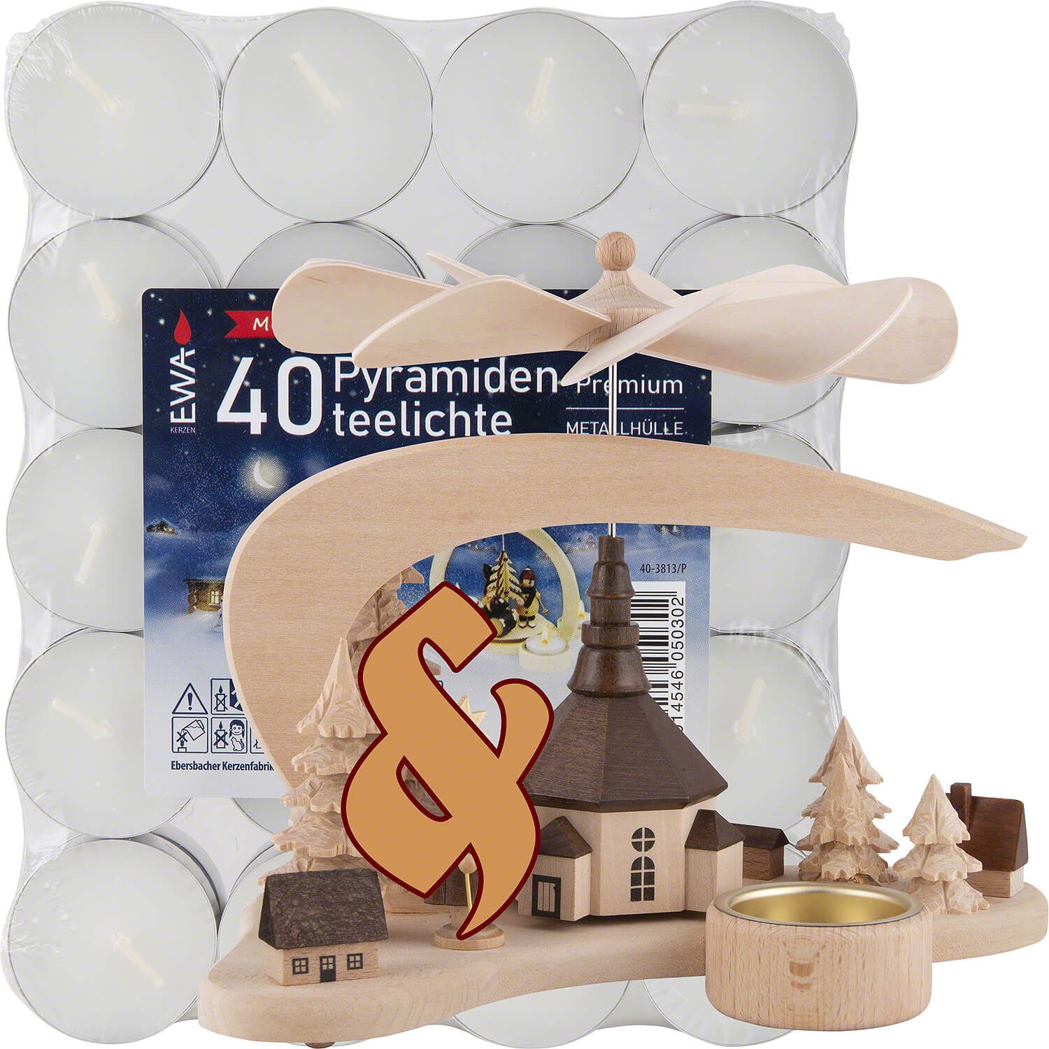 Exklusives Angebot im Erzgebirge-Palast Dieses Set enthält 1× 1-stöckige Pyramide Massivholz Dorf Seiffen - 17 cm 1× Pyramiden-Teelichter Premium, 40 Stück Produktabbildungen sind nicht maßstäblich!