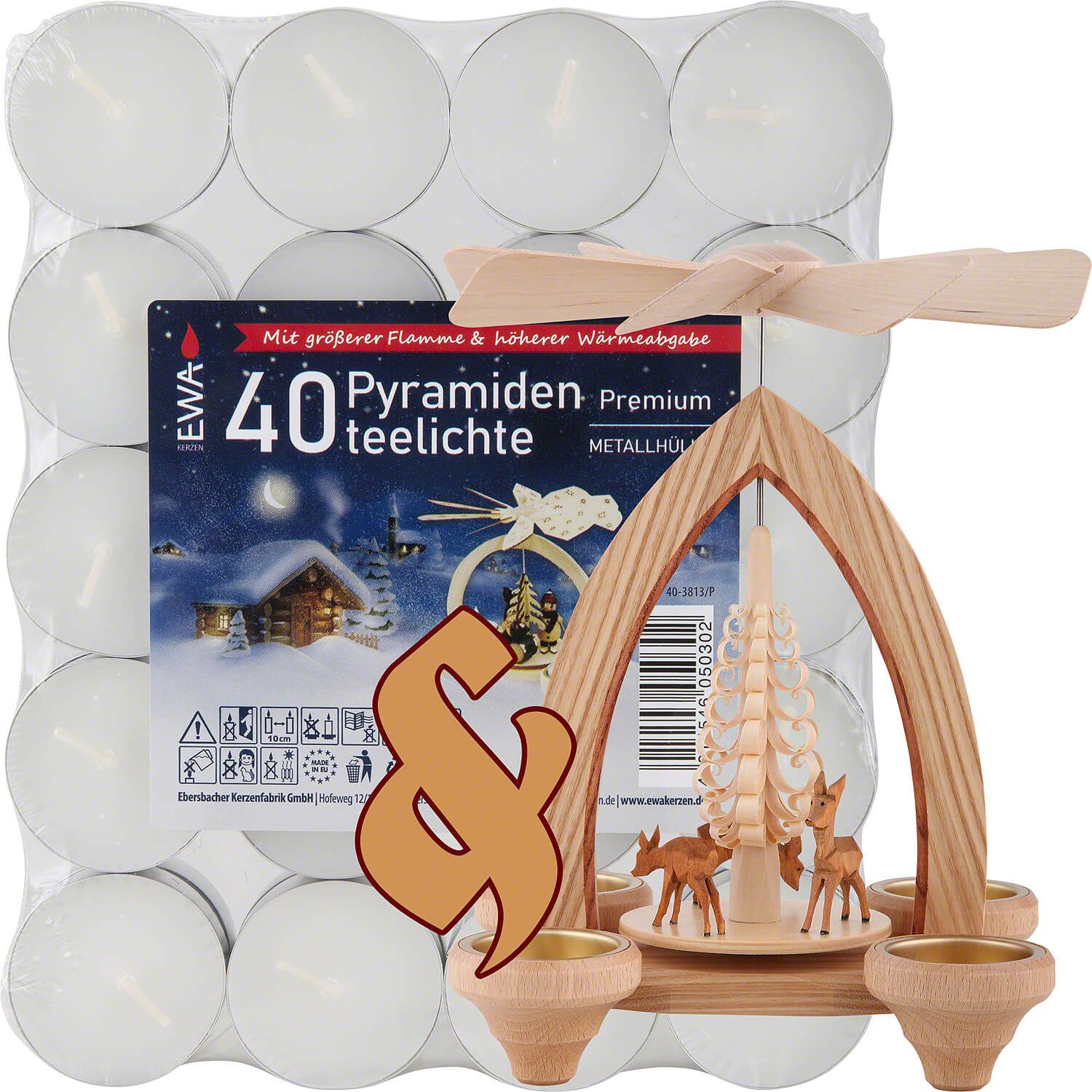 Exklusives Angebot im Erzgebirge-Palast Dieses Set enthält 1× 1-stöckige Pyramide Rehe - natur - 26 cm 1× Pyramiden-Teelichter Premium, 40 Stück Produktabbildungen sind nicht maßstäblich!