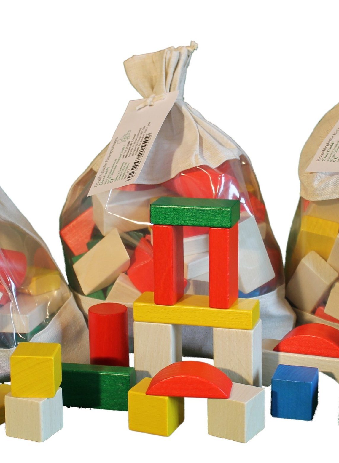 Holzspielzeug Baubeutel mit Holzbausteinen 70 tlg farbig Ein ganzer Beutel voller robuster Bausteine aus Holz. Holzsteine zum bauen fördern nicht nur die Kreativität sondern auch das mathematisches Verständnis, Grobmotorik, Feinmotorik und 3-dimensionales Denken. Sie lassen sich zu einen schönen Bauwerk zusammensetzen. Gefertigt wird alles in einer alten Firma, die direkt ihren Sitz im Erzgebirge hat. Die 70 farbigen Steine sind in einem Sack verpackt. Lieferumfang 1 Beutel NEU |