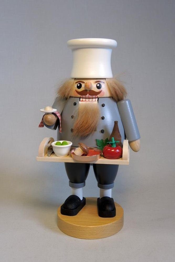 Nussknacker Gourmetkoch Nussknacker aus Holz, die die Nüsse mittels Hebeltechnik in ihrem Mund knacken, werden besonders in der Weihnachtszeit als Dekoration aufgestellt. Holen Sie sich einen ganz besonderen Nussknacker der in verschieden Arbeitsschritten komplett in Seiffen gefertigt. Das oft grimmige Aussehen der Nussknackergesichter soll an die damalige Obrigkeit erinnern. Der Gourmet koch hat eine Размер von 21 cm und farbig gestaltet. Er hat eine weiße Mütze auf dem Kopf, eine graue Jacke an und dunkle Hosen an. In den Händen vor sich hält er ein Tablett mit leckerem Essen. Seine Haare und der Bart bestehen aus weichem Fell Höhe= 21cm NEU |