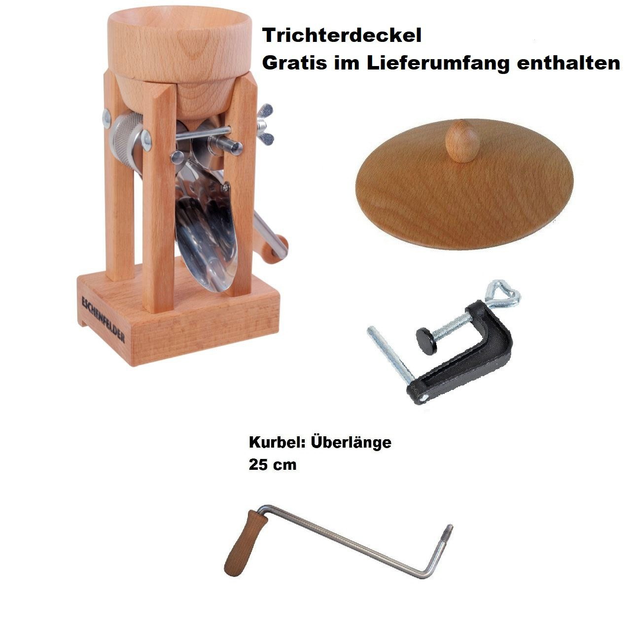 Mitgeliefertes Zubehör | Kornquetsche Tischmodell mit Holztrichter Tisch-Schraubzwinge Bedienungsanleitung Reinigungsbürste Trichterdeckel Kurbel 20cm oder 25cm Длина |