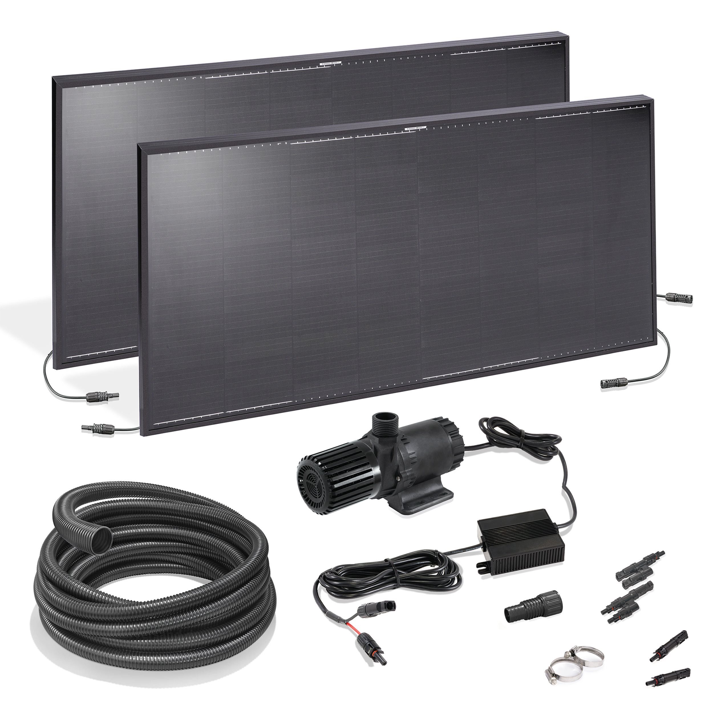Lieferumfang | 2x PV-Solarmodule 135 Wp mit ca. 50 cm Kabel und MC kompatiblen Steckverbindungen, 1x Set 2-fach Verteiler zur Verschaltung der Solarmodule mit MC kompatiblen Steckverbindungen, 2x Sperrdioden mit MC kompatiblen Steckverbindungen, 1x Stück Umwälzpumpe 36 V/ 8000 l/h mit ca. 5 m Kabel und MC kompatiblen Steckverbindungen, 1x Vorfilter auf Pumpe aufschraubbar, 1x Schlauchanschluss für Pumpe und Schlauchschellen, 1x 5 m Spiralschlauch mit 32 mm Durchmesser, Bedienungsanleitung |