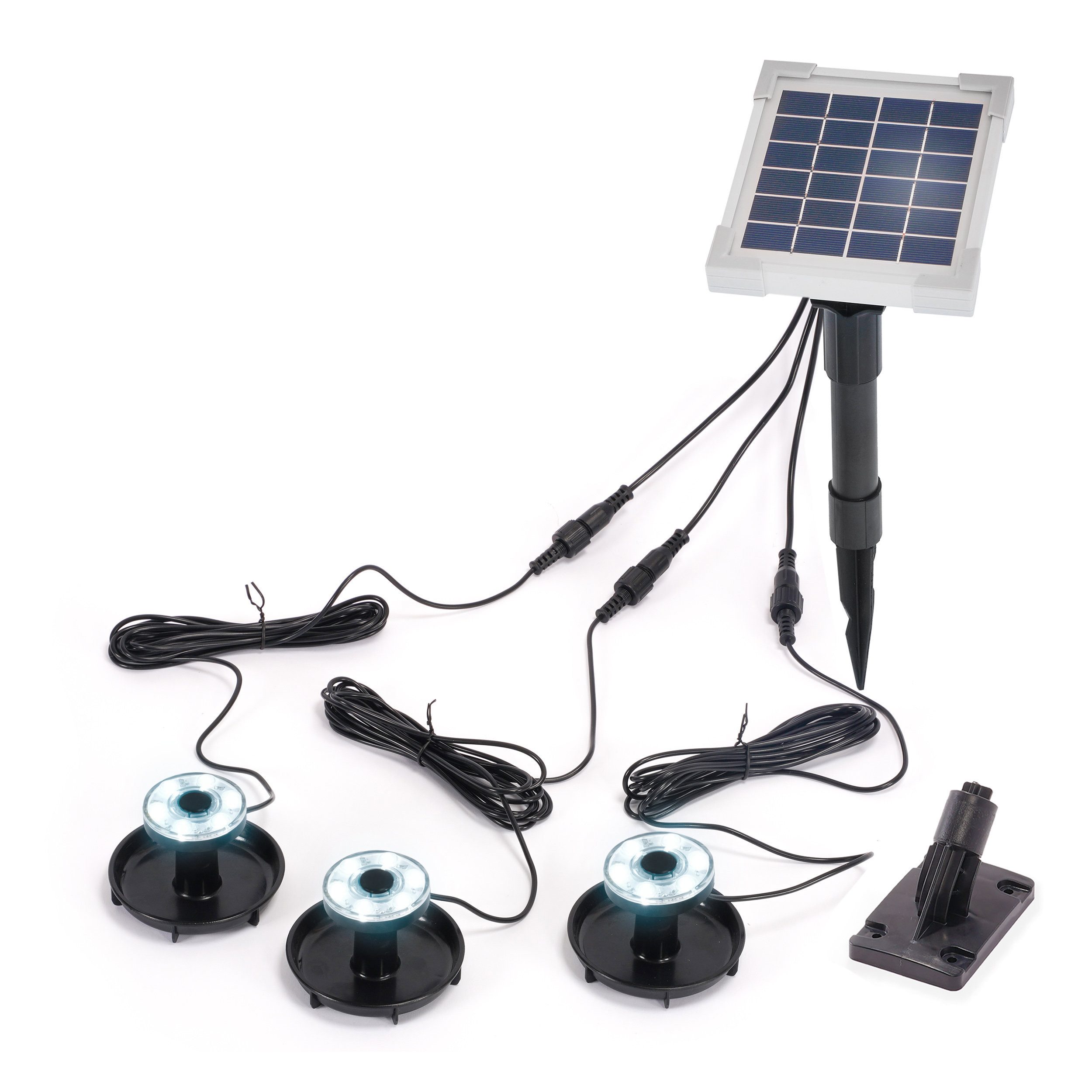 Lieferumfang | Solarmodul, Akku, Erdspieß mit Verlängerungsrohr für Solarmodul, Wandhalterung für Solarmodul, 3x LED Spots mit je 3m Anschlussleitung, 3x Standfüße für LED-Lichtringe, 4x Schrauben und Dübel, 1 x Sechskantschlüssel |