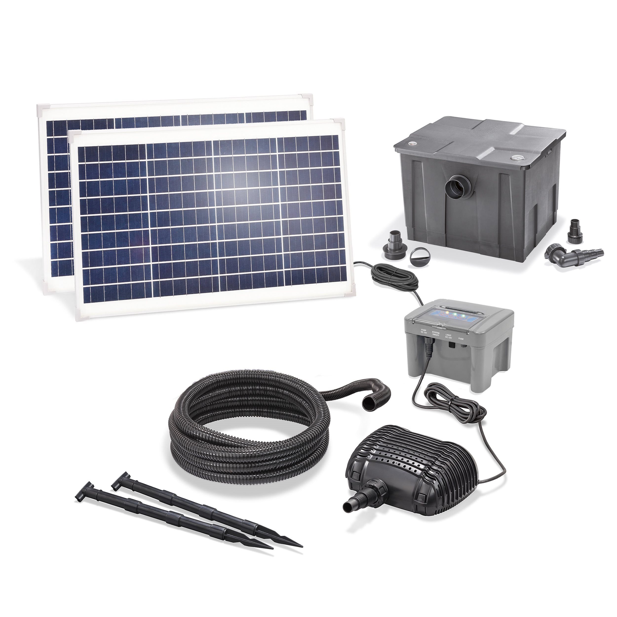Lieferumfang | 2x 35 Wp Solarmodule, 2x Erdspieße für Solarmodule, 1x Y-Kabel für Solarmodule, 1x Akkubox mit 12,8 V/ 12 Ah LiFe Akku, 1x 5 m Verlängerungskabel Akkubox zum Y-Verteiler, 1x Bachlaufpumpe mit 5 m Kabel, 1x 5 m Spiralschlauch mit 32 mm Durchmesser, 1x Außenfilter, 1x Anleitung |