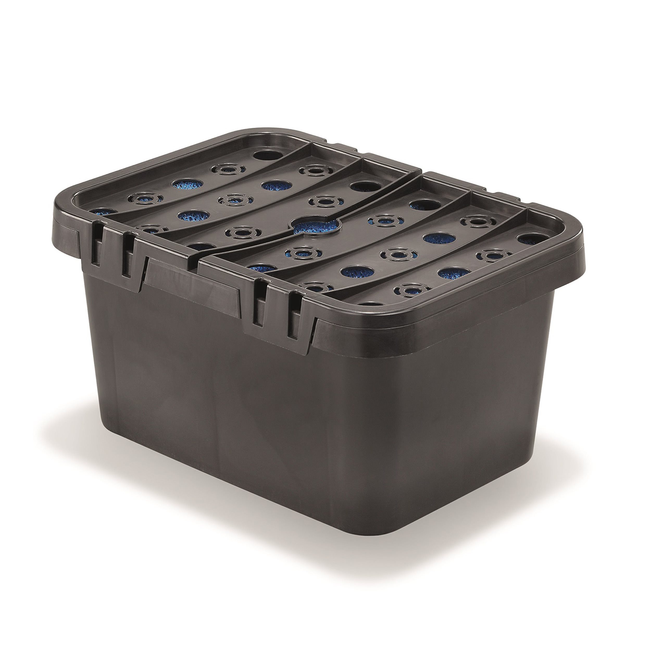 Ist die Filterbox im Teich versenkt, dann dringt das Wasser durch die Löcher in der Oberseite der Filterbox ein und wird von den innenliegenden Filtermedien gereinigt. Anschließend pumpt die Pumpe das Wasser durch das Steigrohr zurück in den Teich.