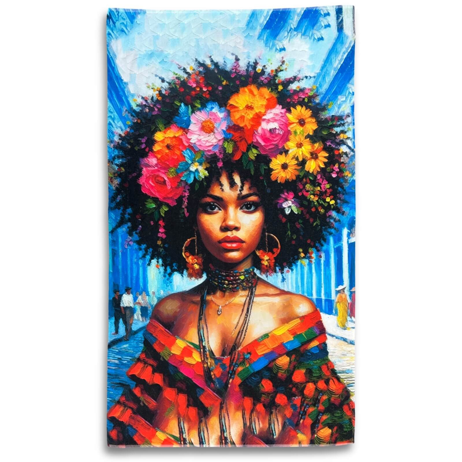 Dieses wunderschöne Strandlaken zieht alle Blicke auf sich! Mitten in den Straßen Havanas scheint der Blick dieser kubanischen Dame jeden Betrachter in den Bann ziehen zu wollen. Ein imposantes Blumenbouquet schmückt die Haarpracht der anmutigen Frau und raubt einem fast den Atem. Das traditionelle Kostüm und der auffällige Schmuck verleihen dem Motiv seine typische kubanische Handschrift. Jede Frau wird es lieben, sich mit diesem Badetuch abzutrocknen. Ob am Strand, im Schwimmbad oder am Pool, mit diesem farbenprächtigen Design werden Sie garantiert stilvoll auffallen.