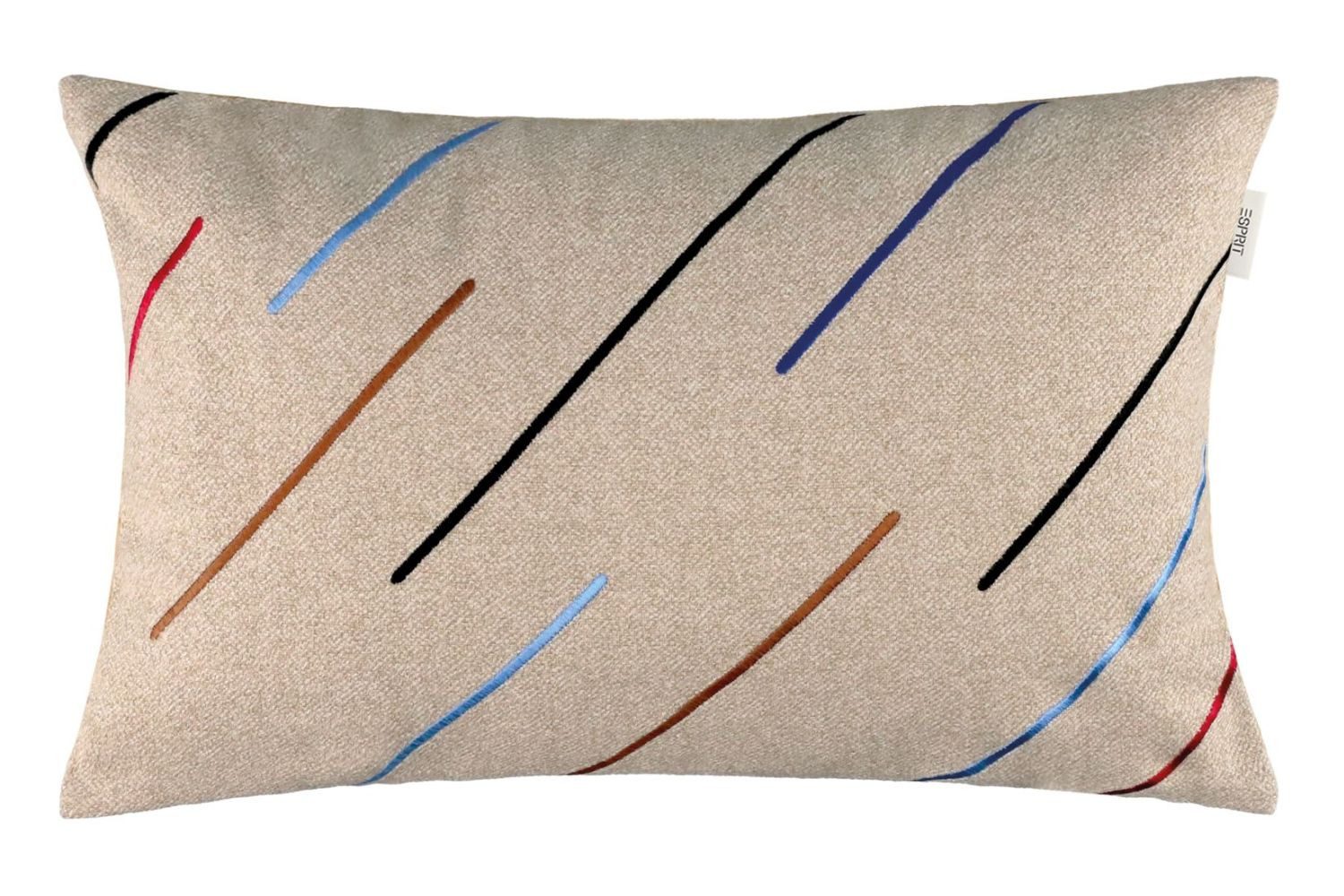 Die Vorderseite der Kissenhülle ist aus einem eleganten, einfarbigen Melange-Stoff gefertigt und mit farbenfrohen Diagonalstreifen bestickt. Diese Kombination aus zurückhaltendem und gleichzeitig lebendigem Design verleiht dem Kissen eine dynamische Optik und macht es zum Blickfang in jeder Einrichtung. Die Rückseite hingegen ist aus luxuriösem Samt in einem warmen Beigeton gefertigt. Dieser Stoff sieht nicht nur edel aus, sondern fühlt sich auch unglaublich weich an – perfekt für entspannte Momente.