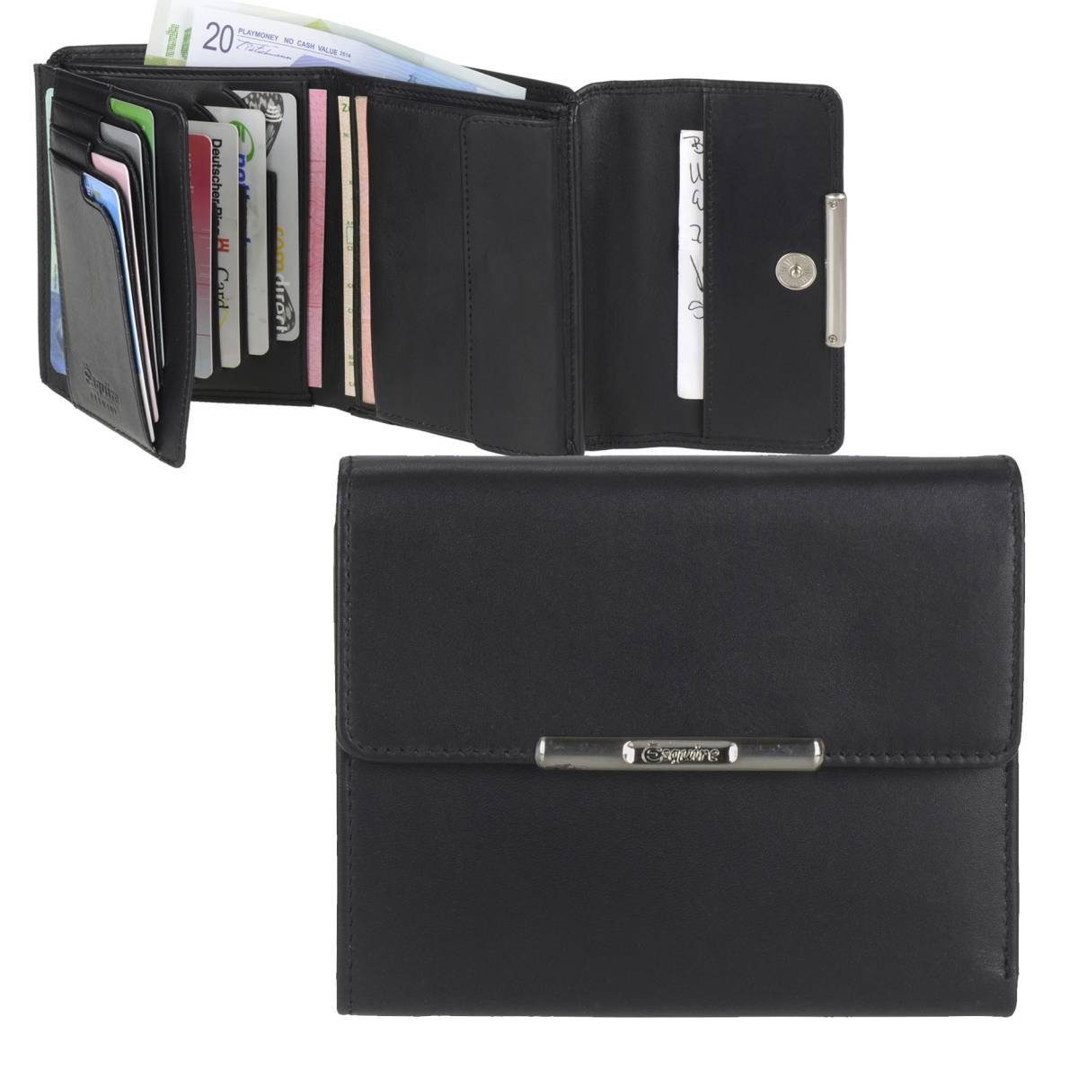 Die schwarze Esquire Damenbörse "HELENA" aus feinem Nappaleder ist die ideale Begleitung für alle Frauen, die Wert auf ein stilvolles und kompaktes Portemonnaie legen. Die Börse verfügt über 12 Kartenfächer, 5 Einsteckfächer, 2 Scheinfächer und 1 Kleingeldfach mit Einkaufschiphalterung und Esquire-Chip. Das Sichtfensterfach ist passend für den großen Personalausweis. Das elegante Design der Börse macht sie zu einem absoluten Blickfang. Sie wird sicherlich jeden Tag zu Ihrer Lieblingsaccessoire. Jetzt die Esquire Damenbörse "HELENA" bestellen und stilsicher unterwegs sein!