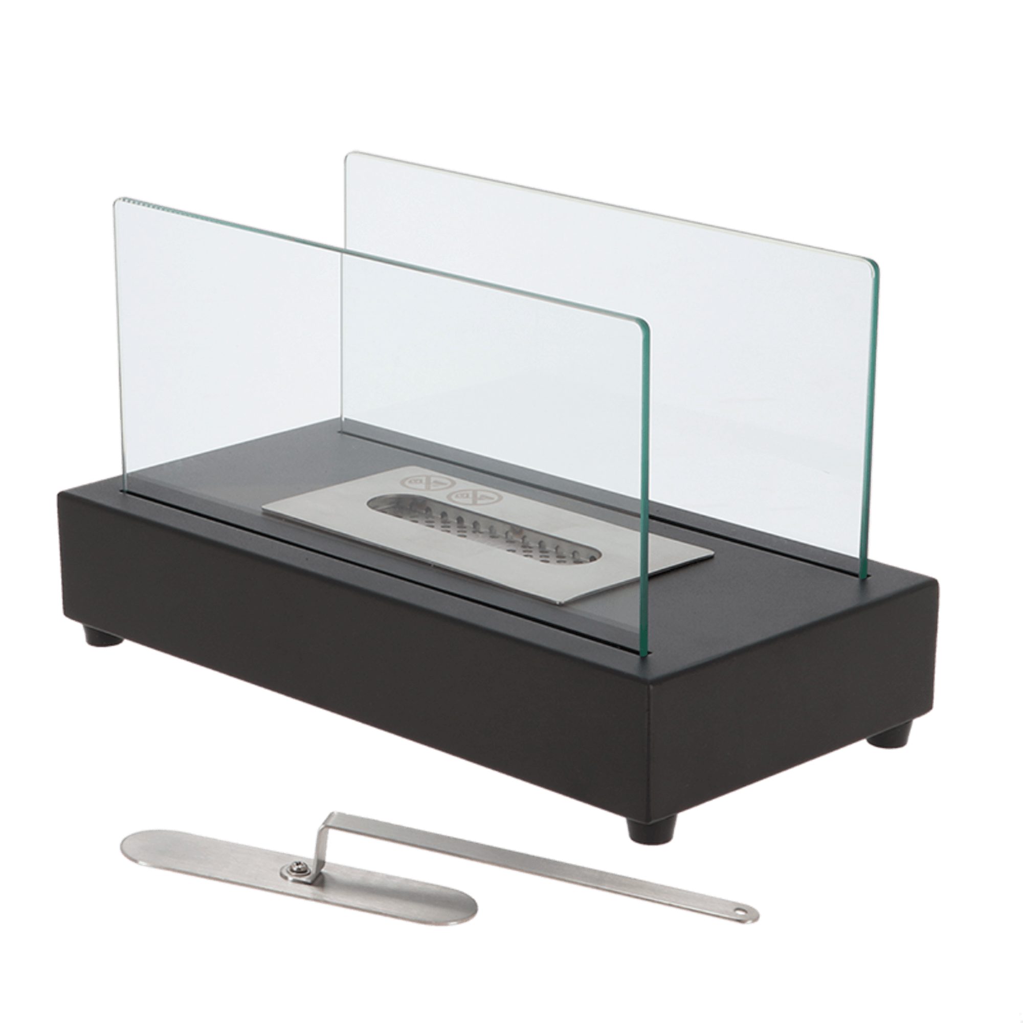 Das Tischfeuer besteht aus Edelstahl und Glas und ist in schlichtem schwarz und silber gehalten.