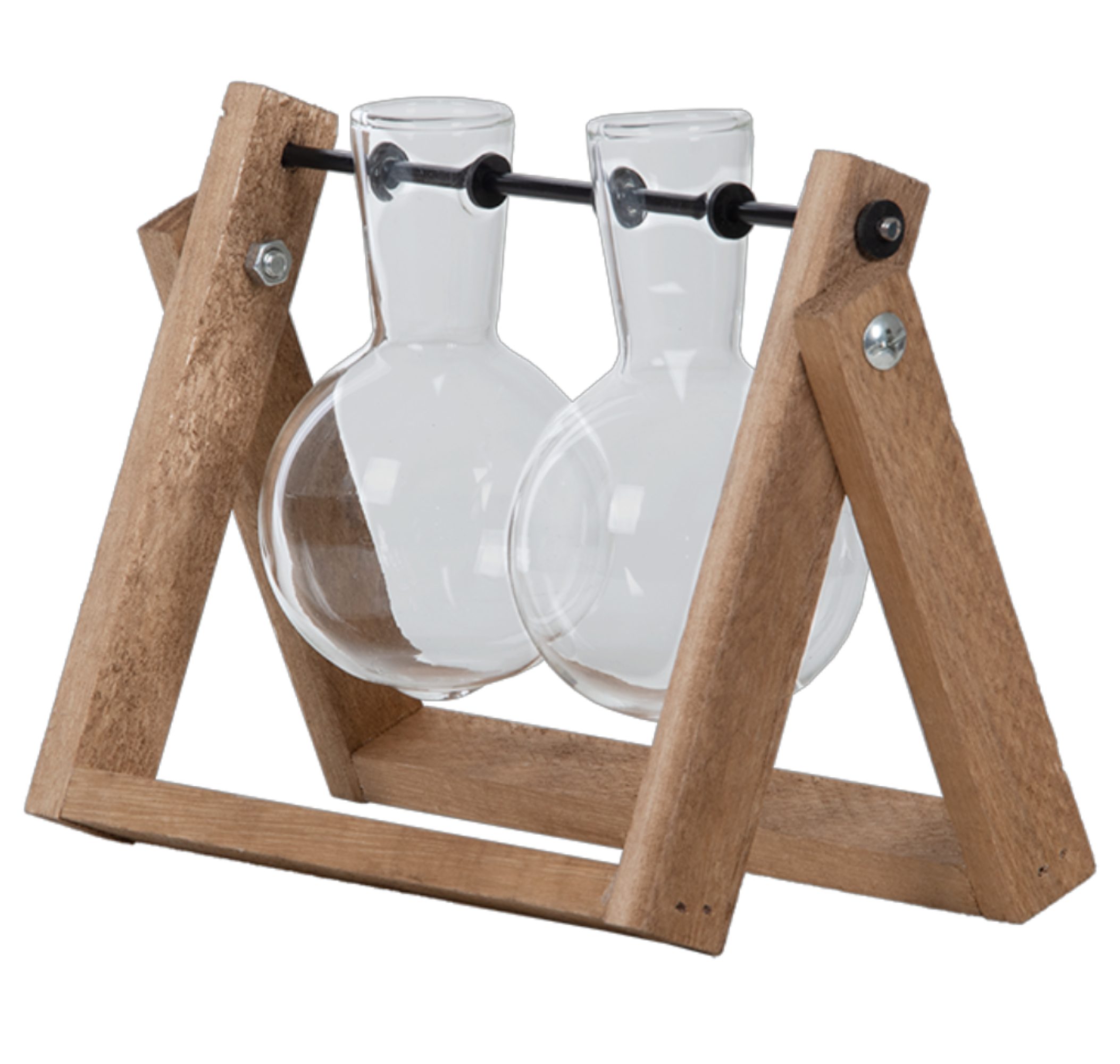 Mit diesem Stecklings Set aus Holz mit zwei Glasvasen können Stecklinge einfach gepflegt werden.