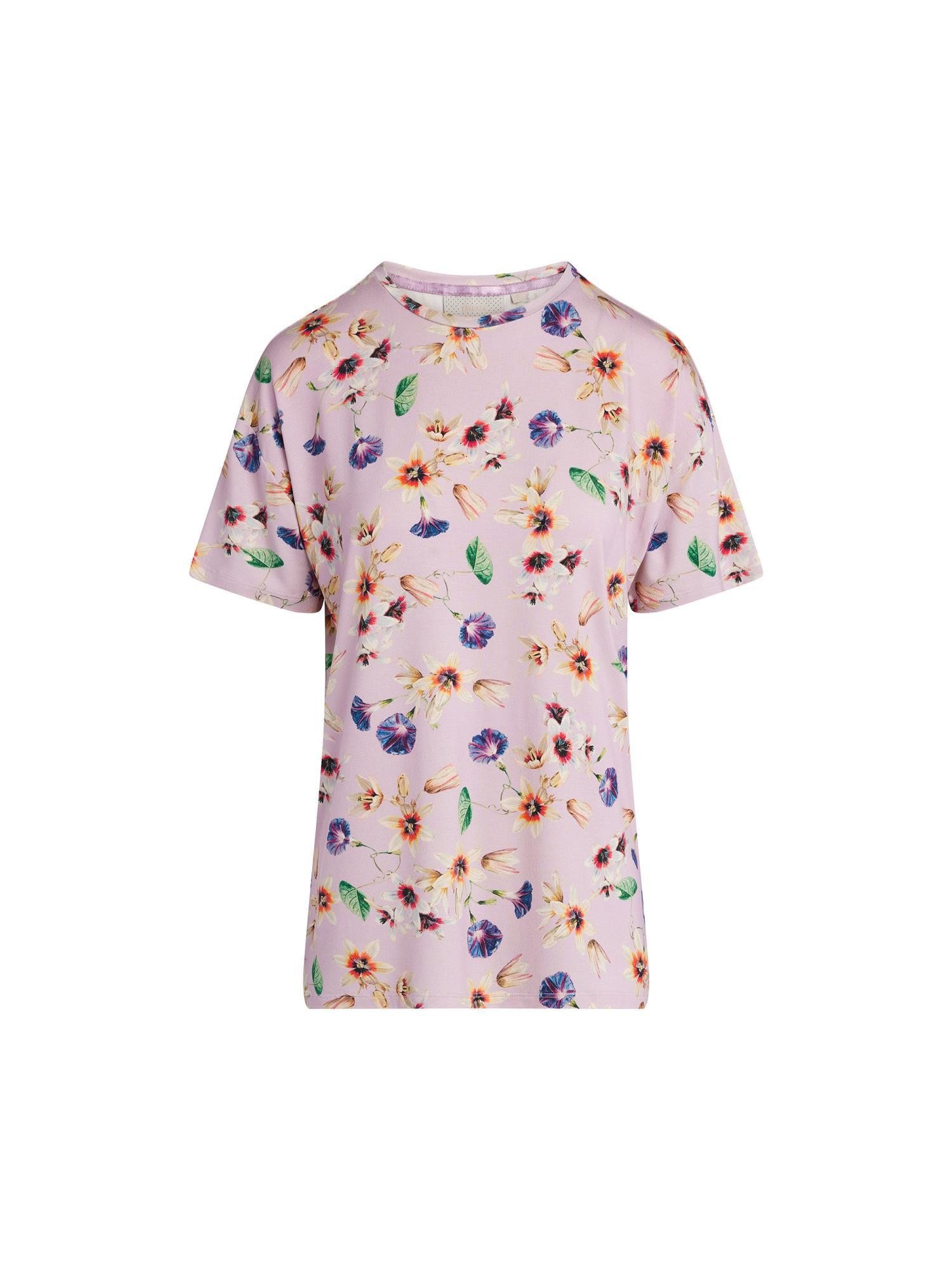 Der Fiorre-Print zeigt eine anmutige Sammlung von Blumen, inspiriert von zwei Zeichnungen von Eelke Jelles Eelkema aus dem frühen 19. Jahrhundert. Diese erfrischende Komposition kombiniert die charmante Ixea-Blume und die üppige Prunkwinde zu einem lebendigen sommerlichen Blumenmuster. Die sternförmigen Ixea-Blumen, mit ihren bunten Kernen, die Schmetterlinge anziehen, bilden einen lebhaften Kontrast zur üppigen lila Prunkwinde, die den Sommer mit einer Fülle von Blumen umarmt. Dieses kurzärmelige Oberteil hat einen runden, hohen Ausschnitt mit schmalem Besatz. Das Oberteil fällt auf die Hüften und hat eine entspannte Passform, was es perfekt für einen lässigen und bequemen Look macht. Dieser Stoff besteht aus EcoVero-Viskose und Elasthan. EcoVero-Viskose ist bekannt für ihre Weichheit und ihren seidigen Glanz, der eine edle Optik verleiht. Es handelt sich um eine nachhaltige Варианты der Viskose, die aus zertifizierten erneuerbaren Holzquellen gewonnen und mit geringerem Umwelteinfluss produziert wird. Der Zusatz von Elasthan verleiht dem Material zusätzliche Elastizität, wodurch es sich angenehm an den Körper anschmiegt und komfortabel mit jeder Bewegung mitgeht.