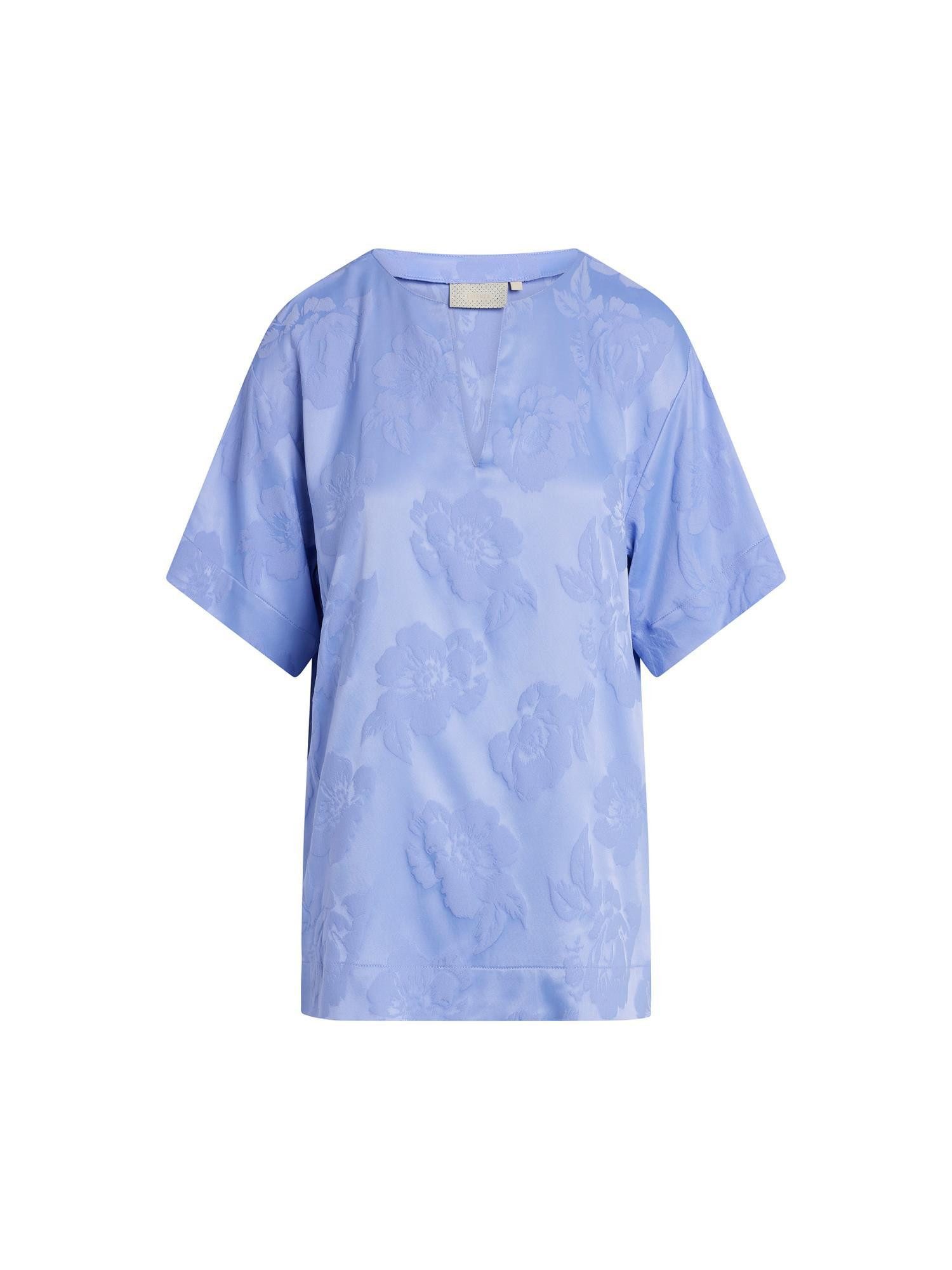 Charley zeigt einen bezaubernden Tanz des Frühlings in voller Blüte. Die anmutige Blumenkollektion in einem zarten Lavendelblau strahlt Romantik aus. Es ist eine wunderschöne Hommage an das Erwachen der Natur, wo Frische und Gelassenheit zusammenkommen. Lassen Sie sich von der vibrierenden Energie dieser Blumen mitreißen, von denen jede eine eigene Geschichte erzählt und die wie Kunstwerke auf Stoff zum Leben erwachen. Verleihen Sie Ihrer Garderobe mühelose Eleganz mit dem Lily-Top, das durch eine lockere, gerade Passform und raffinierte Details besticht. Der V-Ausschnitt und die halblangen Ärmel verleihen dem Top einen zeitlosen Look, während die subtilen Seitenschlitze zusätzliche Bewegungsfreiheit bieten. Perfekt für einen komfortablen und dennoch stilvollen Look. Dieser Stoff besteht aus einer Mischung aus Viskose, recyceltem Polyester und Elasthan. Die Viskose verleiht ein weiches, luxuriöses Gefühl, das recycelte Polyester sorgt für Langlebigkeit und Formbeständigkeit, und Elasthan bietet Elastizität und Tragekomfort.