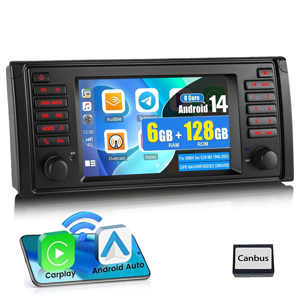 7 Zoll Android 14 Autoradio für BMW 5er E39 1995-2003: Das Android Autoradio mit 7" 1280* 720 IPS kapazitivem Touchscreen, 6GB RAM und 128GB ROM ermöglicht das Herunterladen Ihrer Lieblings-Apps und -Videos, damit das Autofahren nicht mehr langweilig wird. Kein zusätzlicher Rahmen, kein Kabelwechsel, Plug and Play. Es wird mit Canbus geliefert und unterstützt die meisten Originalfunktionen: Lenkradsteuerung, Rückwärtssignale und Lesen von Original-Computerdaten usw.