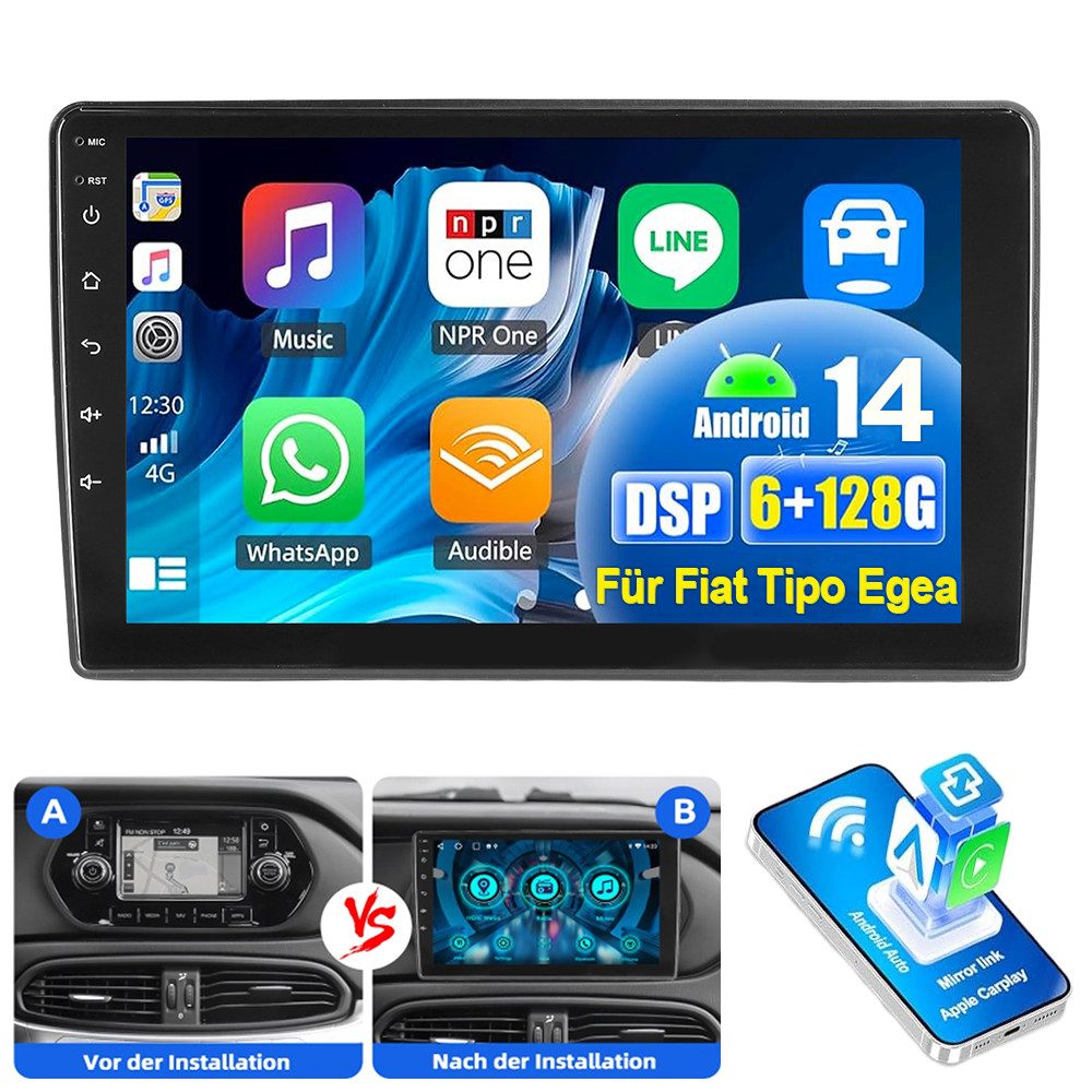 9 Zoll Android 14 Autoradio Für Fiat Tipo Egea 2015-2021: Das Android Autoradio mit 9" 1280* 720 HD kapazitivem Touchscreen, 6GB RAM und 128GB ROM ermöglicht das Herunterladen Ihrer Lieblings-Apps und -Videos, damit das Autofahren nicht mehr langweilig wird. Kein zusätzlicher Rahmen, kein Kabelwechsel, Plug and Play. Es wird mit Canbus geliefert und unterstützt die meisten Originalfunktionen: Lenkradsteuerung, Rückwärtssignale und Lesen von Original-Computerdaten usw.