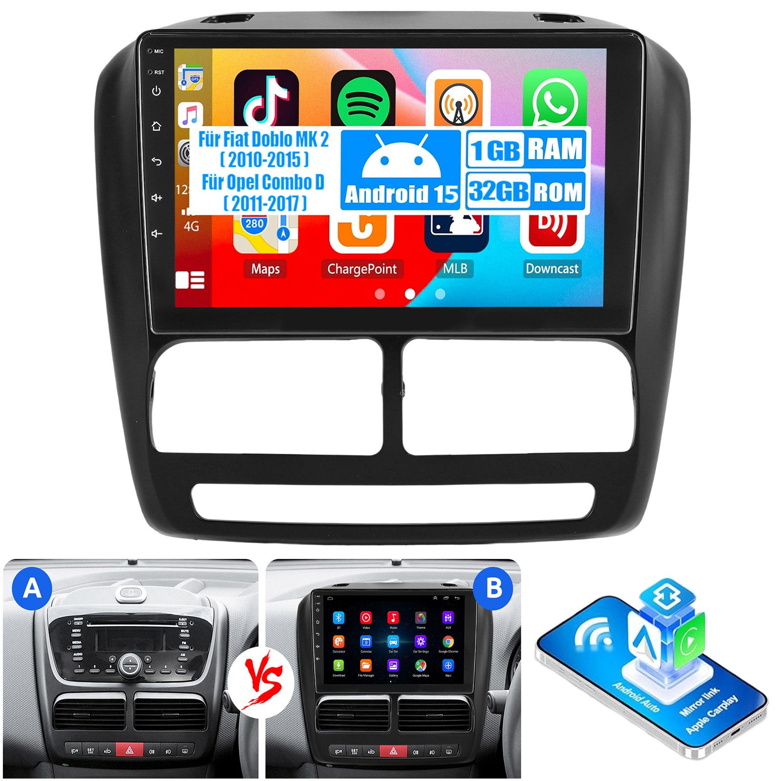 9 Zoll Android 15 Autoradio für Für Fiat Doblo MK2 2010-2015 / Opel Combo D 2011-2017 : Das Android Autoradio mit 9" 1280* 720 HD kapazitivem Touchscreen, 1GB RAM und 32GB ROM/2GB RAM und 64GB ROM/4GB RAM und 64GB ROM ermöglicht das Herunterladen Ihrer Lieblings-Apps und -Videos, damit das Autofahren nicht mehr langweilig wird. Kein zusätzlicher Rahmen, kein Kabelwechsel, Plug and Play. Es wird mit Canbus geliefert und unterstützt die meisten Originalfunktionen: Lenkradsteuerung, Rückwärtssignale und Lesen von Original-Computerdaten usw.