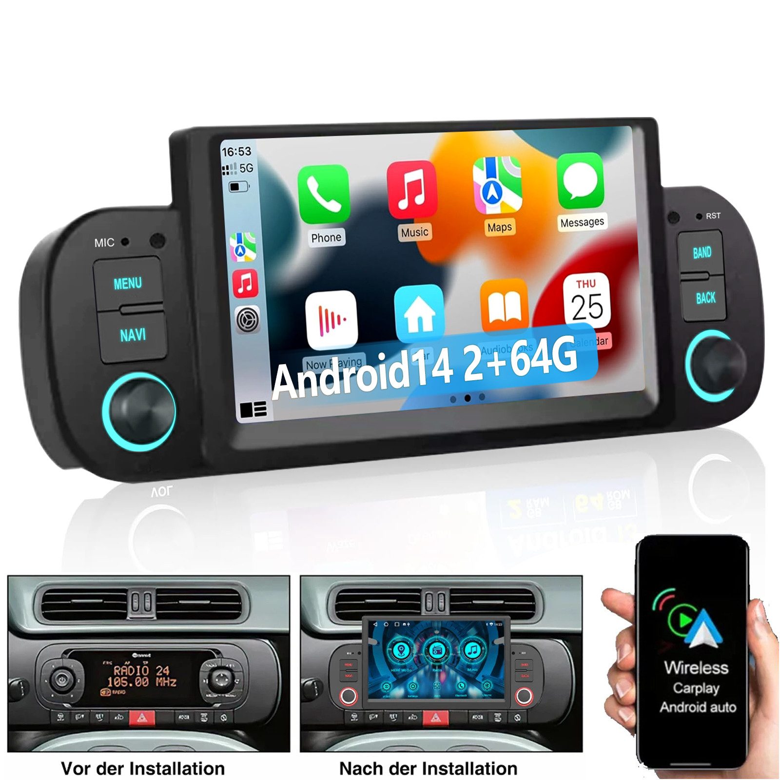 7'' Radio für Fiat Panda Android 14 Auto GPS Navi Carplay : Das Android Autoradio mit 7" 1024* 600 HD kapazitivem Touchscreen, 2GB RAM und 32GB ROM/2GB RAM und 64GB ROM ermöglicht das Herunterladen Ihrer Lieblings-Apps und -Videos, damit das Autofahren nicht mehr langweilig wird. Kein zusätzlicher Rahmen, kein Kabelwechsel, Plug and Play. Es wird mit Canbus geliefert und unterstützt die meisten Originalfunktionen: Lenkradsteuerung, Rückwärtssignale und Lesen von Original-Computerdaten usw.