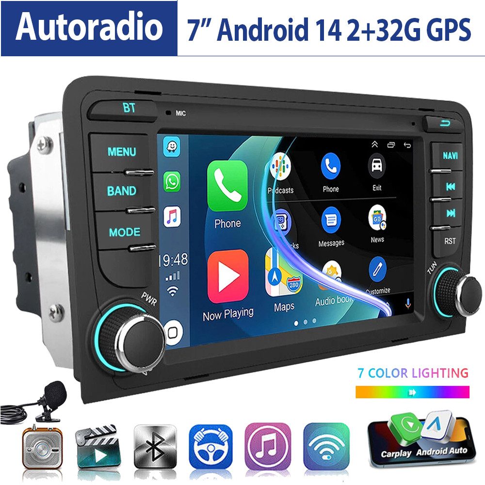 7 Zoll Android 14 Autoradio für Audi A3: Das Android Autoradio mit 7" 1024* 600 HD kapazitivem Touchscreen, 2GB RAM und 32GB/64GB ROM ermöglicht das Herunterladen Ihrer Lieblings-Apps und -Videos, damit das Autofahren nicht mehr langweilig wird. Kein zusätzlicher Rahmen, kein Kabelwechsel, Plug and Play. Es wird mit Canbus geliefert und unterstützt die meisten Originalfunktionen: Lenkradsteuerung, Rückwärtssignale und Lesen von Original-Computerdaten usw.