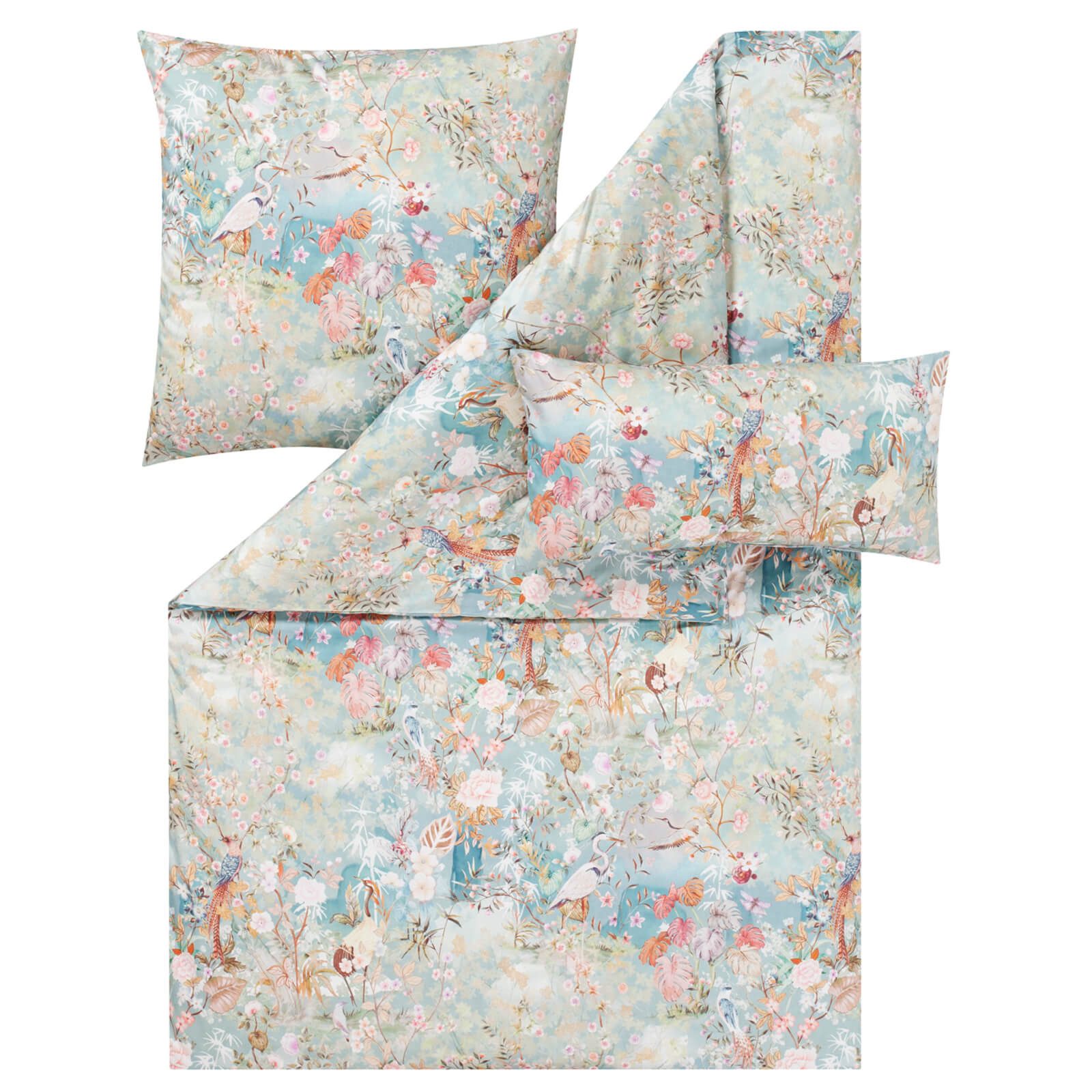 Die Bettwäsche Anthea von Estella verwandelt Ihre Schlafräume in eine Traumoase. Die Garnitur ist mit vielen fantasievollen Blumen und Sträuchern designed. Sprießende Blüten vermischen sich mit Gewächsen in den verschiedensten Pastelltönen. Beim näheren Hinsehen entdeckt man vereinzelt Reiher, Pfaue und Störche. Das farbenfrohe Motiv wird durch den hellen Hintergrund perfekt in Szene gesetzt. Kuscheln Sie sich in den atmungsaktiven und geschmeidigen Bettbezug aus 100 Prozent Baumwolle, in geschmeidiger Mako Satin Qualität und genießen Sie traumhaften Schlaf.