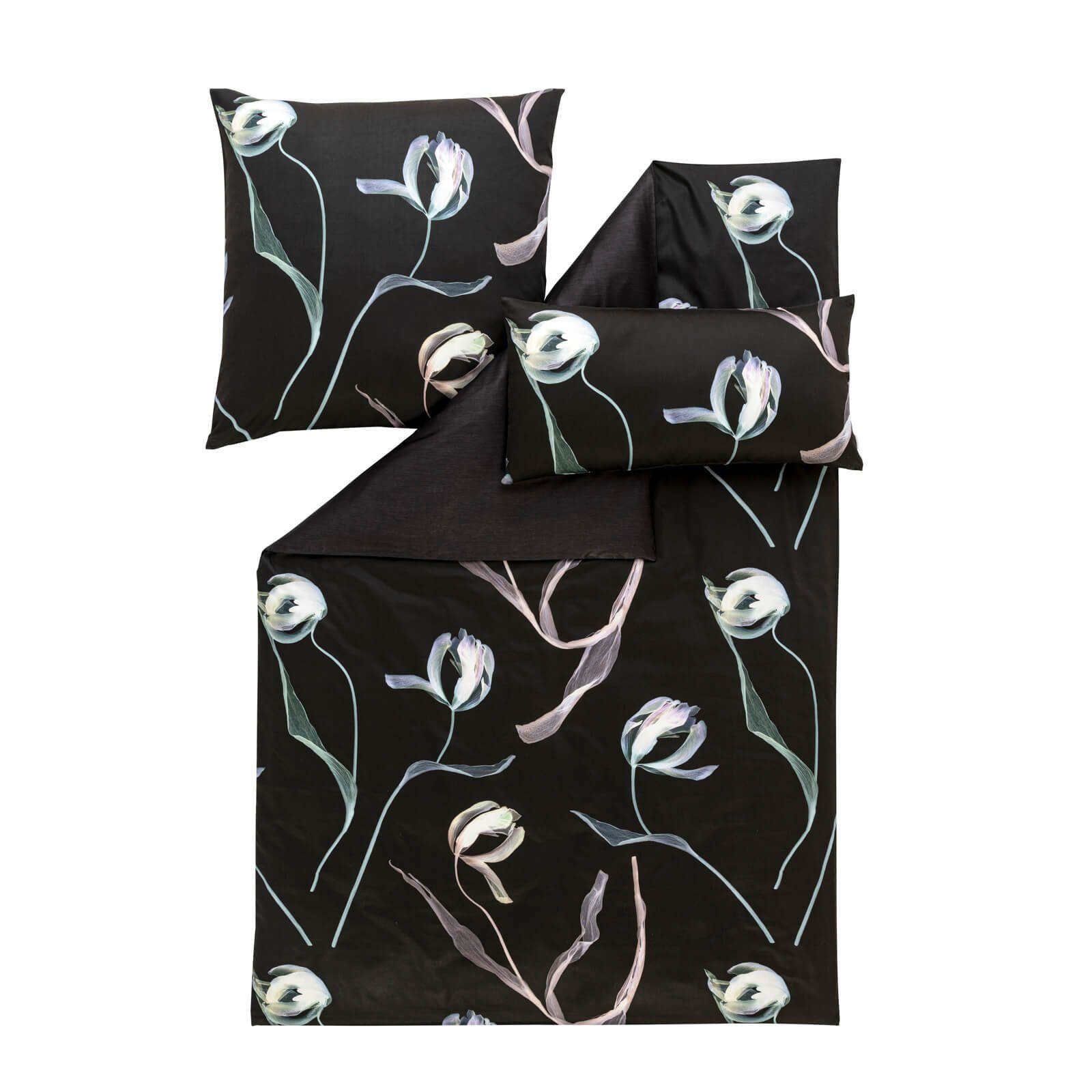 Mit der Bettwäsche Tulipa aus der Kollektion Atelier zaubert Estella ein eindrucksvolles florales Blumendesign in Ihr Schlafzimmer. Imposante filigrane Tulpen stechen auf dem dunklen Hintergrund besonders schön hervor und erinnern an einen bunte Frühlingswiese. Die Rückseite ist einfarbig in Schwarz gehalten und sorgt für eine flexible Gestaltungsmöglichkeit. Die Garnitur ist aus 100 Prozent mercerisierte Baumwolle, in feinster Mako-Satin Qualität hergestellt und bietet Ihnen mit ihrer glatten, weichen und anschmiegsamen Oberfläche allerbesten Schlafkomfort.