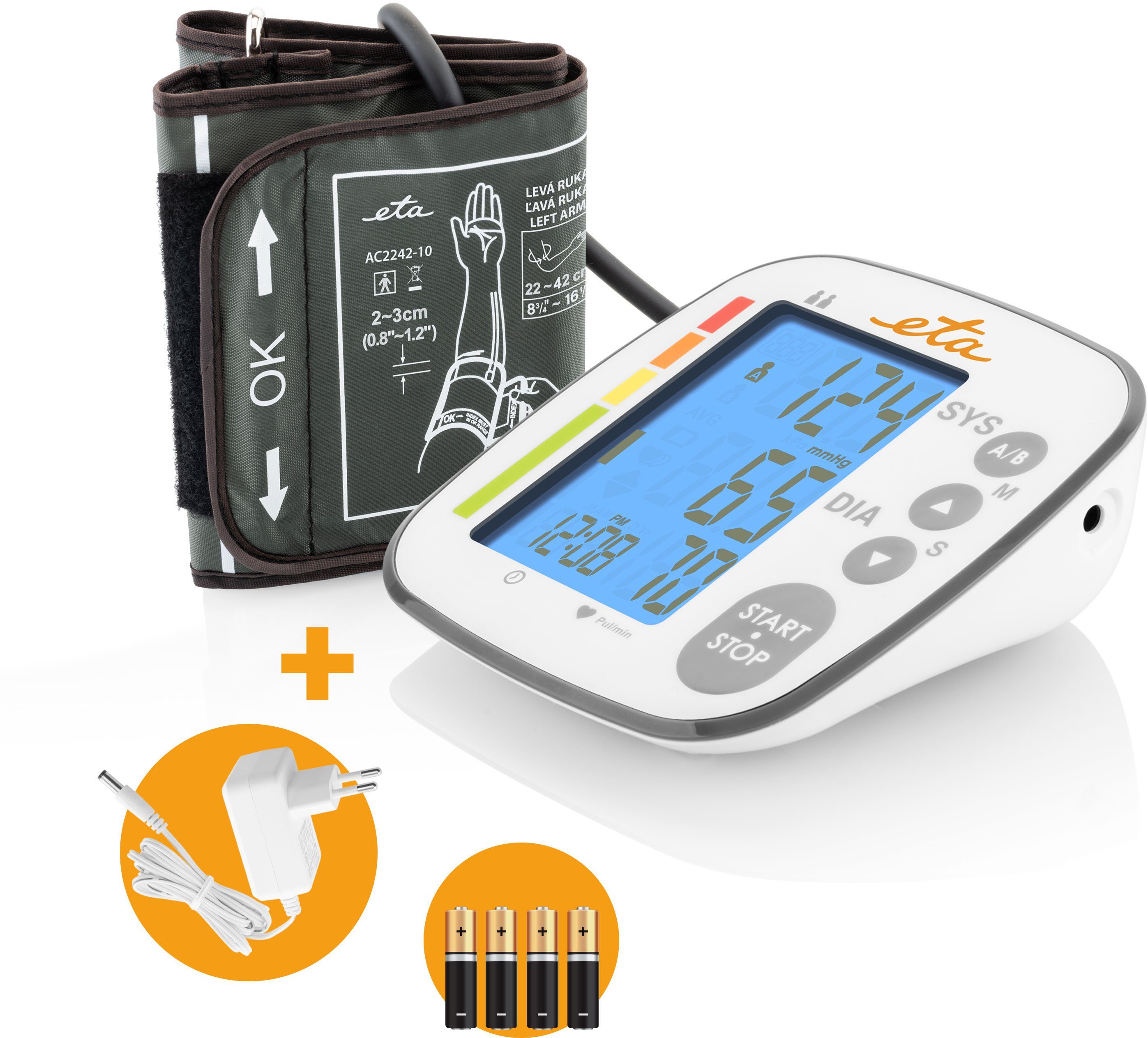 ETA 4297 90000 mit Bluetooth + Adapter ist ein modernes Gerät zur Messung des Blutdrucks am Arm, das auch von Ärzten genutzt werden kann. So können Sie Ihren Blutdruck regelmäßig überprüfen. Zum Druckmessen auf dem Arm verwenden Sie eine Manschette, die folgenden Umfang hat: 42 cm. Sie werden auch rechtzeitig auf mögliche Herzrhythmusstörungen aufmerksam gemacht. Die Blutdruckdaten werden in integrierten Speicher aufgenommen. Das Touch-Design ist eine moderne Bedienweise. Wenn Sie einen noch bequemeren Überblick über Ihre Messwerte wünschen, können Sie die gemessenen Daten mit Ihrem Smartphone teilen. Aus den gemessenen Werten kann das Blutdruckgerät einen Durchschnitt erstellen, damit Sie Ihre Kondition im Auge behalten. Wenn Sie einen noch bequemeren Überblick über Ihre Gesundheit haben möchten, werden Sie es genießen, die Daten mit Ihrem Smartphone teilen zu können. Das Blutdruckmesser ETA ist kompatibel mit dem Betriebssystem Android und iOS. Die Verbindung wird von dieser Schnittstelle bereitgestellt: Bluetooth.