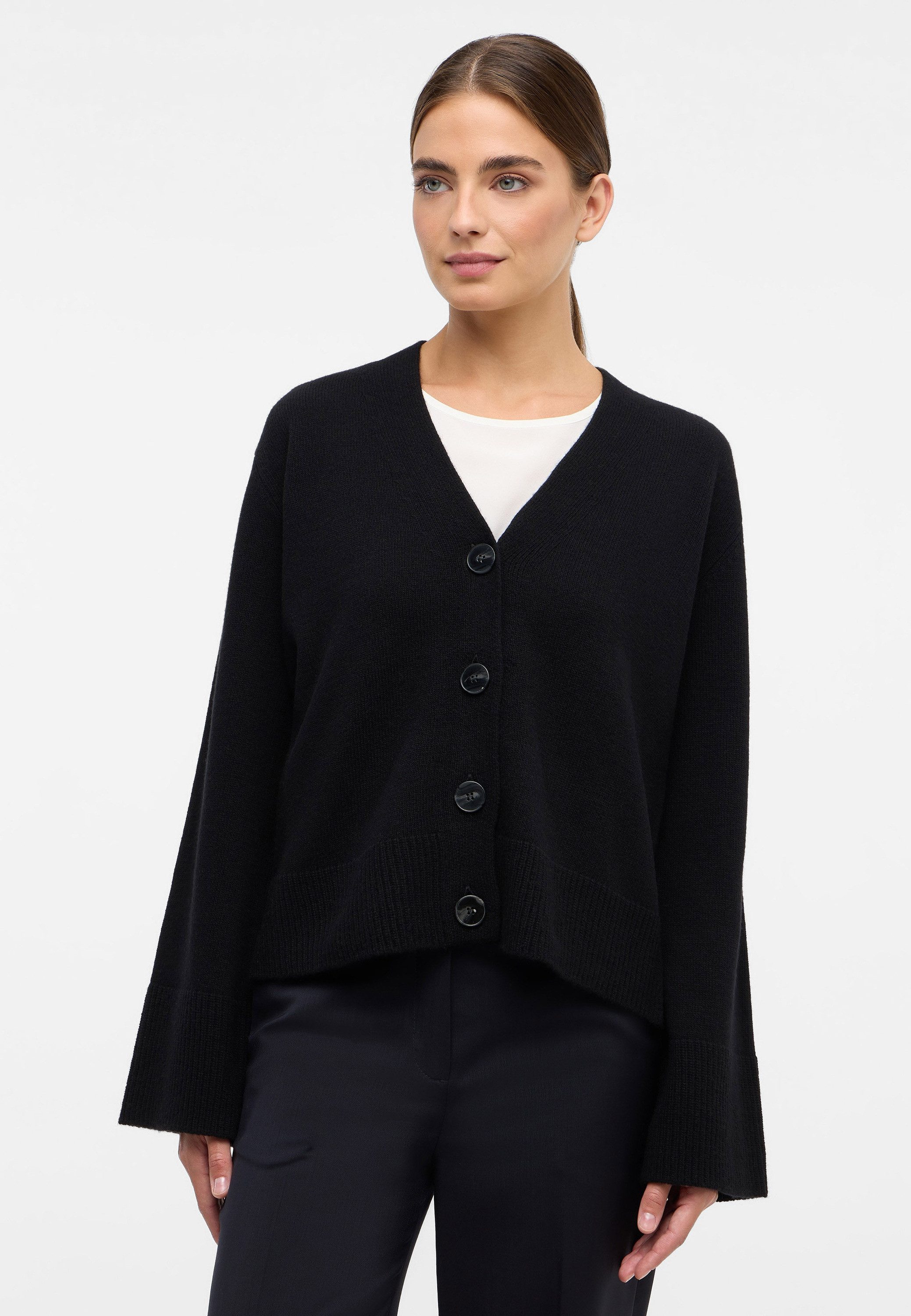 Der Cardigan ist etwas kürzer geschnitten und besitzt einen V-Ausschnitt.