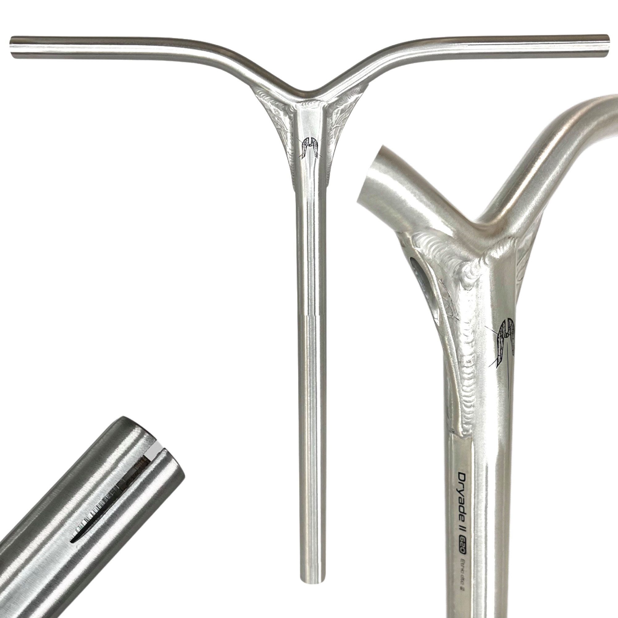 Endlich ist sie da, die zweite Generation der legendären Ethic Dryade Stunt-Scooter Bar. Nach dem Erfolg der Dryade V1 hat sich das Team von Ethic daran gesetzt einen noch leichteren und noch besser angepassten Lenker zu entwickeln der seinen Vorgänger in den Schatten stellt. Die neue Dryade V2 besteht aus dem leichten und haltbaren Aluminium 6061 welches mittels des T6 Wärmebehandlungsverfahrens noch zusätzlich verdichtet und ausgehärtet worden ist. Durch das Optimieren der Bar erreichte Ethic eine leichtere und um 16% stabilere Варианты des V1. Dieser Lenker kommt auf ein unglaubliches Gesamtgewicht von nur 681g. Durch eine in die Stange geschlagene Starnut beträgt das Gewicht des Lenkers faktisch 709g. Das macht die Dryade wahrscheinlich zur leichtesten Bar die es auf dem Markt gibt. Deshalb eignet sie sich ausschließlich für den Skate Park und ist nicht zum Street-Fahren geeignet! Sie hat die Maße 57cm x 56cm und einen sogenannten "Backsweep" von 3°.