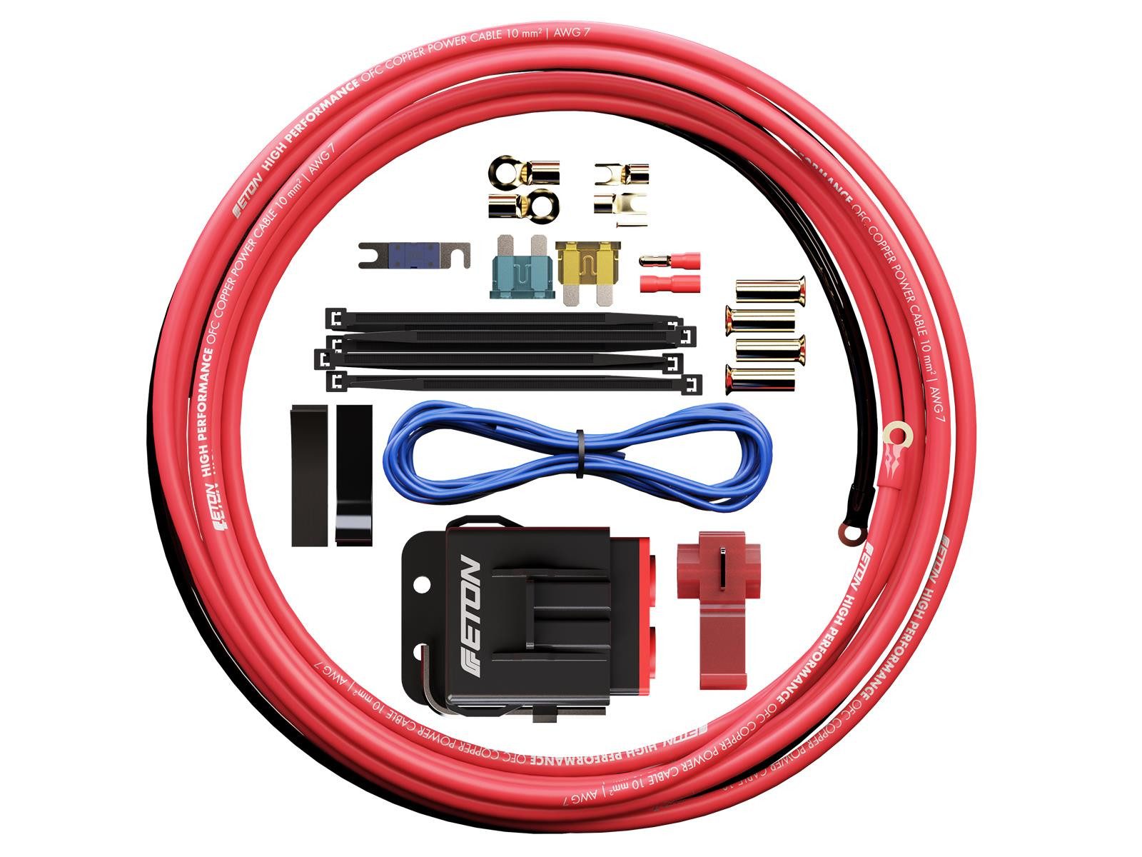 Hochwertiges Stromanschluss-Kabelkit, 10 qmm (AWG 7), mit passendem Zubehör für den leichten Anschluss eines Verstärkers oder Aktiv-Subwoofers o.ä. im Fahrzeuginneren. Das hochwertige Set besticht durch seine einzigartige Verpackung, in dieser befindet sich alles, was man zum professionellem Anschluss benötigt: