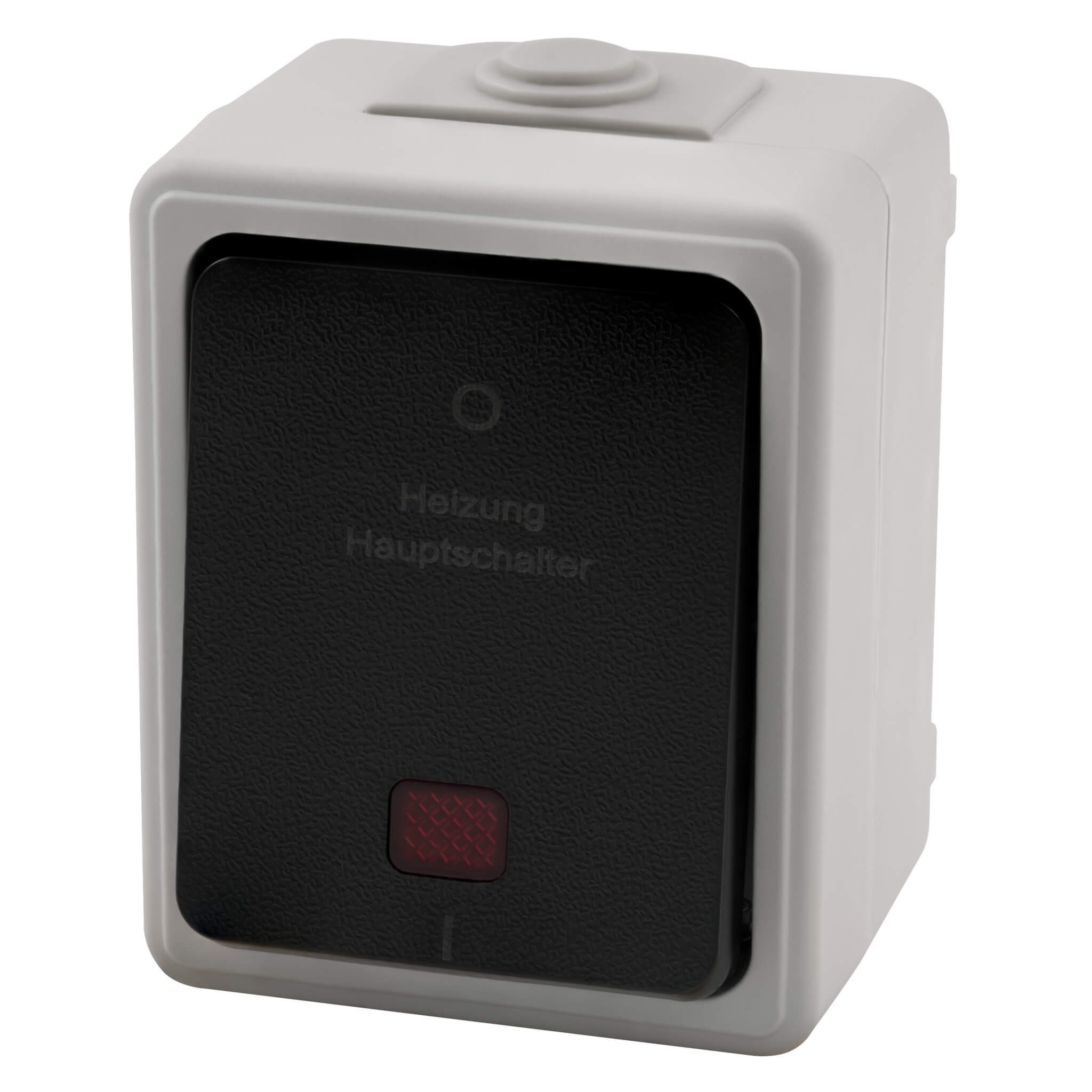 Spritzwassergeschützter Aufputz Heizung Hauptschalter mit grauem Rahmen und schwarzem Taster. Wippe mit dezentem Aufdruck Heizung Hauptschalter.