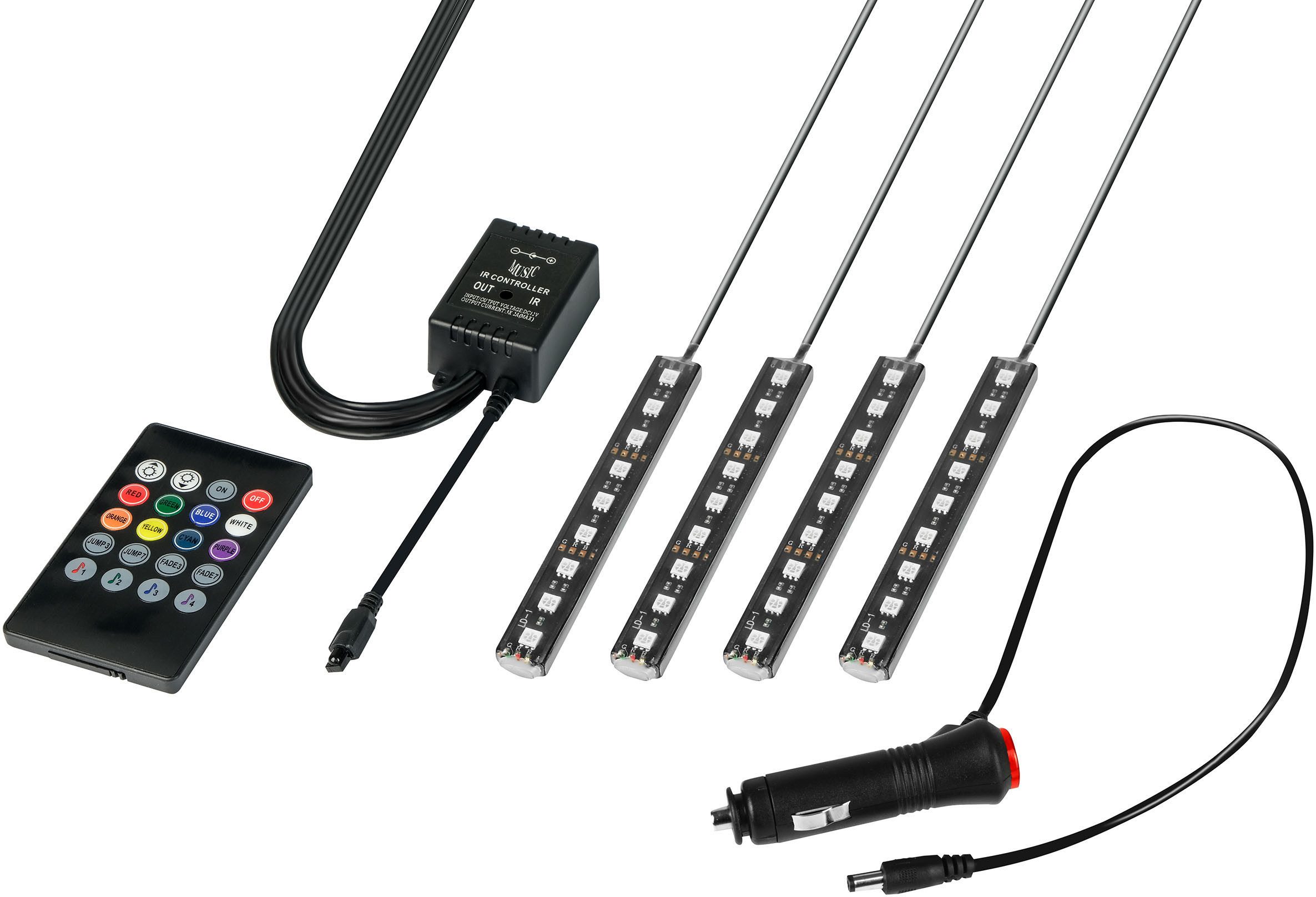 Lieferumfang | 1 Anschlusskabel für Kfz-Steckdose 1 Fernbedienung mit Batterie (CR2025) 1 Gebrauchsanleitung 4 LED-Streifen mit IR-Controller und IR-Empfänger |