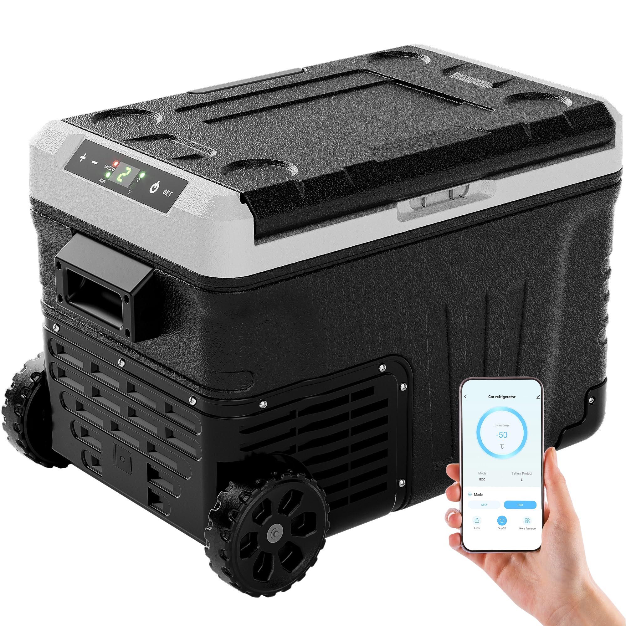 App-Steuerung: Der Campingkühlschrank verfügt über ein einfaches LCD-Bedienfeld, mit dem Sie ihn über Tasten bedienen oder Temperatur und Spannung über eine mobile App steuern können. Die Bedienung ist kinderleicht.
