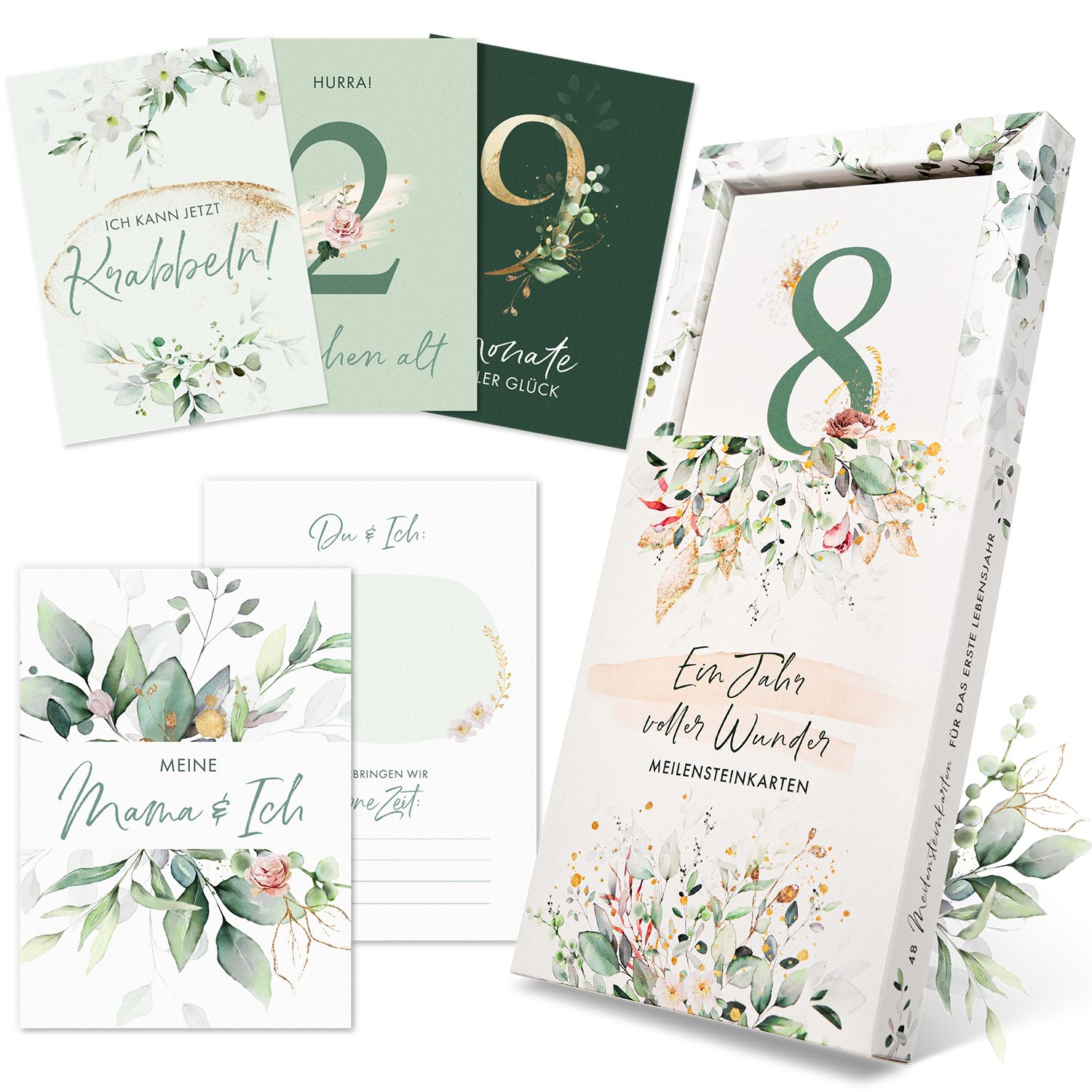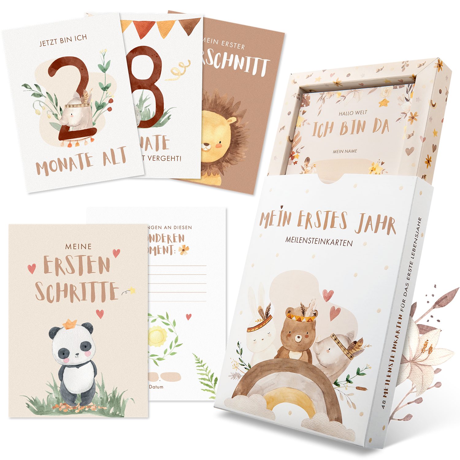 Meilensteinkarten „Mein erstes Jahr“ – für wundervolle Babyerinnerungen Haltet die Glücksmomente und Meilensteine des ersten Lebensjahres eures Babys mit unseren liebevoll gestalteten Meilensteinkarten auf kreativen Fotos fest – und teilt sie mit Familie und Freunden. "So entsteht ein ganz persönlicher Erinnerungsschatz an diese besondere Zeit." Die Rückseiten der Karten wurden gemeinsam mit Pädagog:innen entwickelt und bieten viele kreative Möglichkeiten, Gedanken, Erlebnisse und besondere Momente aufzuschreiben und für immer festzuhalten. Die 48 handgemalten Karten kommen in einer hochwertigen Erinnerungsbox und begleiten euch durch das gesamte erste Jahr – von der Geburt bis zum ersten Geburtstag. Die mit den Karten gestalteten Fotos könnt ihr in das passende Babyalbum einkleben oder an Familie & Freunde verschenken. Tipp: Ergänzt eure Meilensteinkarten mit unserem Babyalbum und Abdruckset – oder wählt direkt das Bundle, um alle besonderen Erinnerungen perfekt festzuhalten.