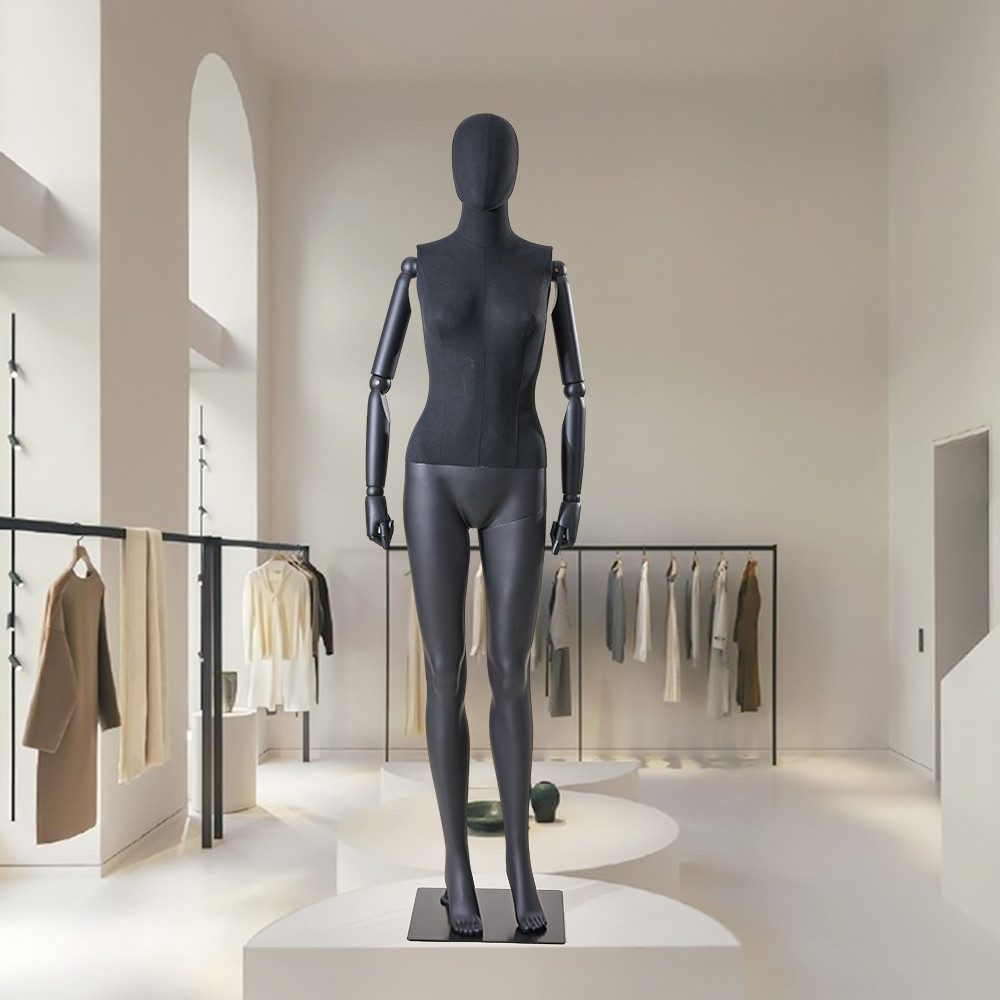 Die Schaufensterfiguren bestehen aus robustem Kunststoff und sind mit einem stoffbezogenen Oberkörper versehen, der für eine edle Optik und Haptik sorgt. Besonders hervorzuheben sind die massiven Holzarme, die beweglich sind und dadurch verschiedene Posen ermöglichen. Dies macht die Figuren besonders flexibel einsetzbar – sei es für die Präsentation von Kleidungsstücken oder für kreative Dekorationszwecke.