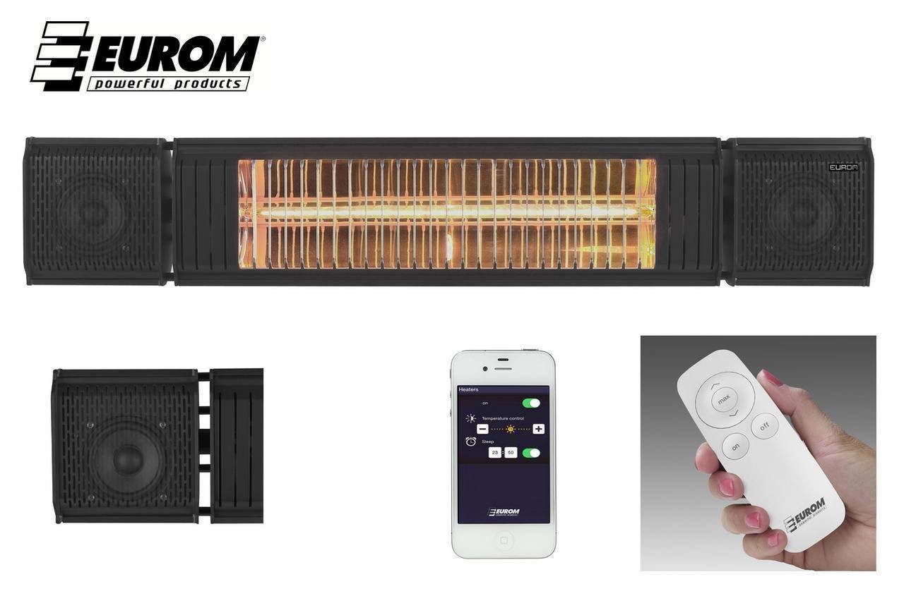 Die Heat and Beat schwarz von Eurom überzeugt durch 3 besondere Merkmale: Heizen, Musik und stimmungsvolle Ambientebeleuchtung! Mit 2000 Watt maximaler Leistung ist das Gerät in der Lage bis zu 20 m² zu beheizen. Die Heizleistung lässt sich entweder in 6 Stufen per mitgelieferter Fernbedienung einstellen, oder stufenlos via Smartphone-Bluetooth und Eurom SmartApp. Eine Golden-Amber-Lampe sorgt für wohlige Wärme bei wenig Lichtemission. Mit zwei 3-Zoll-Boxen lässt sich per Bluetooth zur Verfügung gestellte Musik abspielen. Integrierte LED-Leuchten sorgen für eine stimmungsvolle Beleuchtung. Diese lassen sich ebenfalls per Fernbedienung und App steuern. Die Heat and Beat kann horizontal an der Wand oder hängend an der Decke montiert werden. Sie ist staub- und strahlwassergeschützt dank Isolationsklasse IP65.