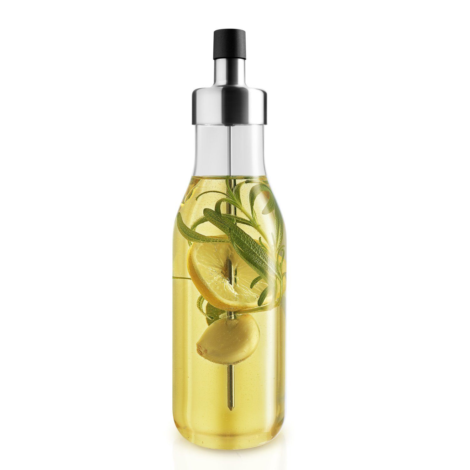 Mit der praktischen und dekorativen Ölflasche MyFlavour von Eva Solo kann man Speiseöl ganz nach dem eigenen Geschmack aromatisieren. Auf den abnehmbaren Spieß im Inneren der Flasche können verschiedene Aromaträger wie Kräuter, Früchte oder Gewürze aufgefädelt werden. So entsteht jedes Mal wieder ein auf den individuellen Geschmack abgestimmtes Speiseöl. Der Gieß-Einsatz der Flasche ermöglicht ein tropffreies Ausgießen. Die Ölkaraffe besteht aus Glas, Edelstahl und Silikon und kann in der Spülmaschine gereinigt werden.
